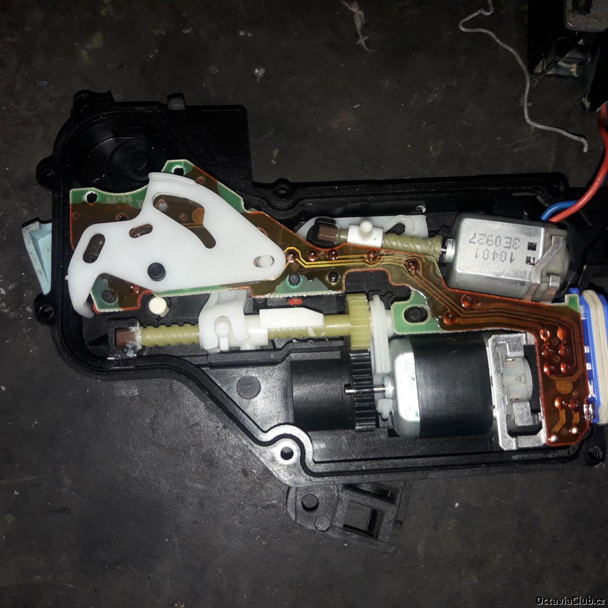 odjistit pružinu povolit oba šroubky co drží k sobě elektrickou a mechanickou část zámku viz foto: vycvaknem obě umělohmotná zajištění a vyndáme elektrickou část z té mechanické -zůstane to pouze propojené kabelem od mikrospínače co je na mechanické části zámku ted je třeba rozebrat tu elektrickou část zámku,povolíme všechny torxi co drží ten vrchní dekl dekl sundáme uvnitř je tištěný spoj,náká ta umělohmotná táhla a dva motorky ted je otázkou kterej z nich odešel, nebo jen zlobí