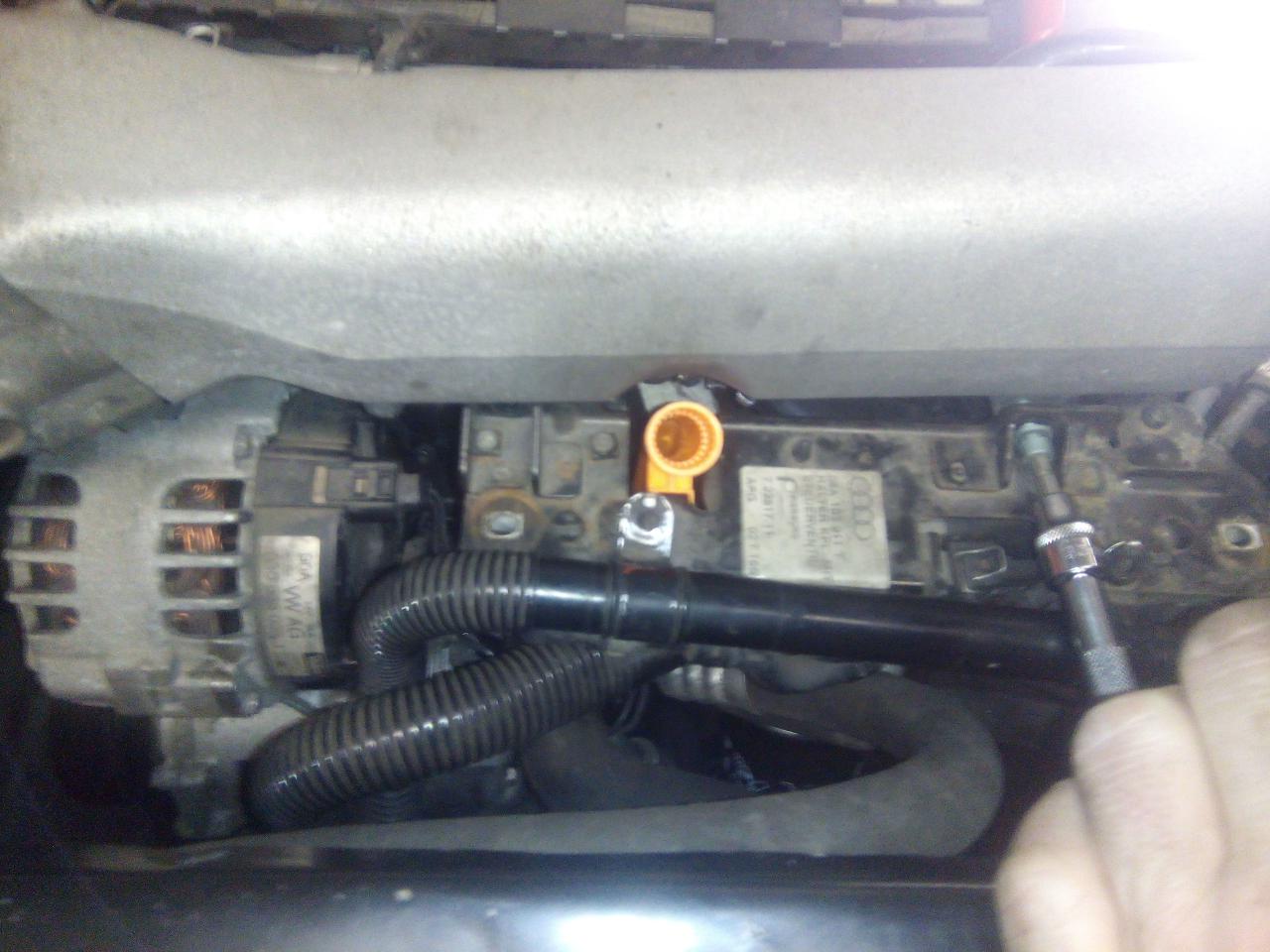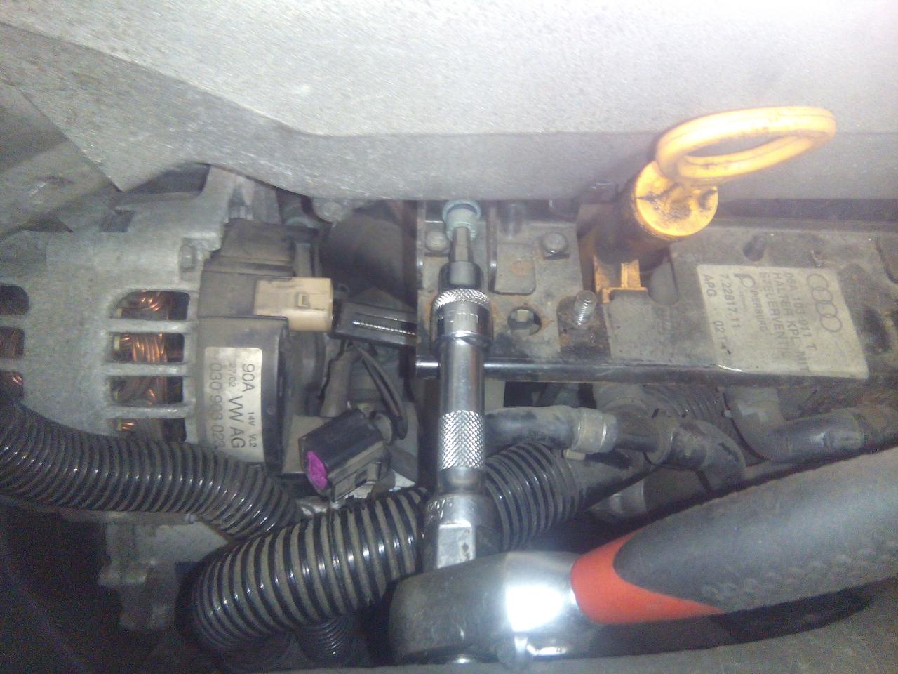 dále povolíme samotný držák,tady dáváme pozor :pozor: je třeba ho vysunout směrem vzhůru neb je za něj zaháknutý trychtýř měrky oleje