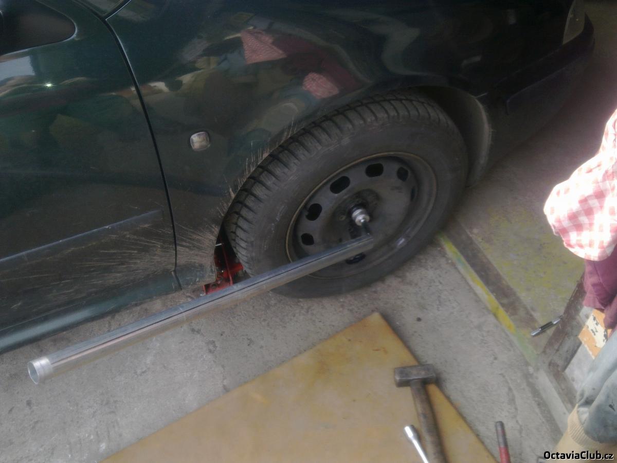 nandáme kolo,pustíme s heveru dolů,dotáhnem středovou matku já na to mám metrovou trubku a loketní moment