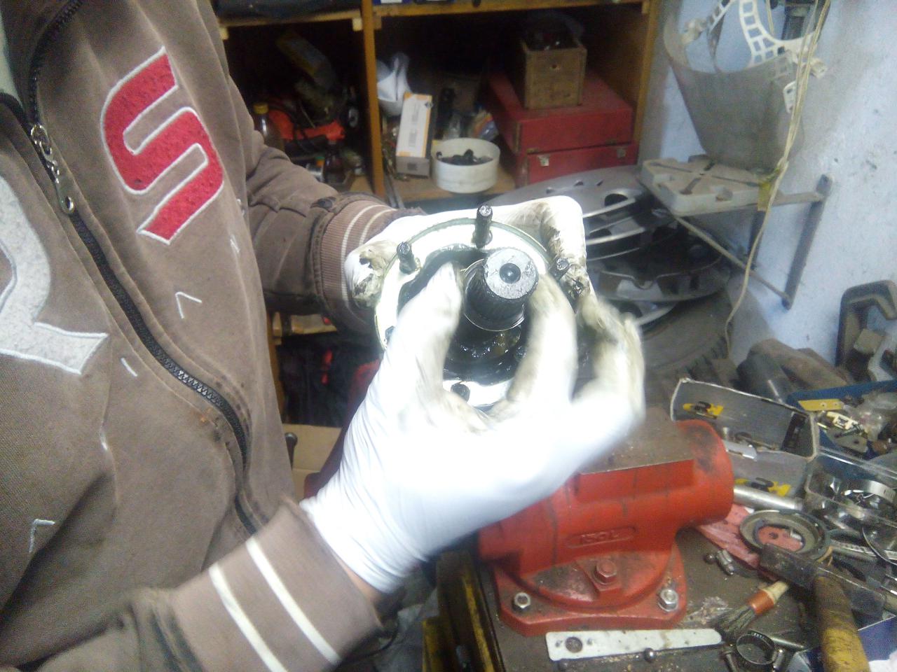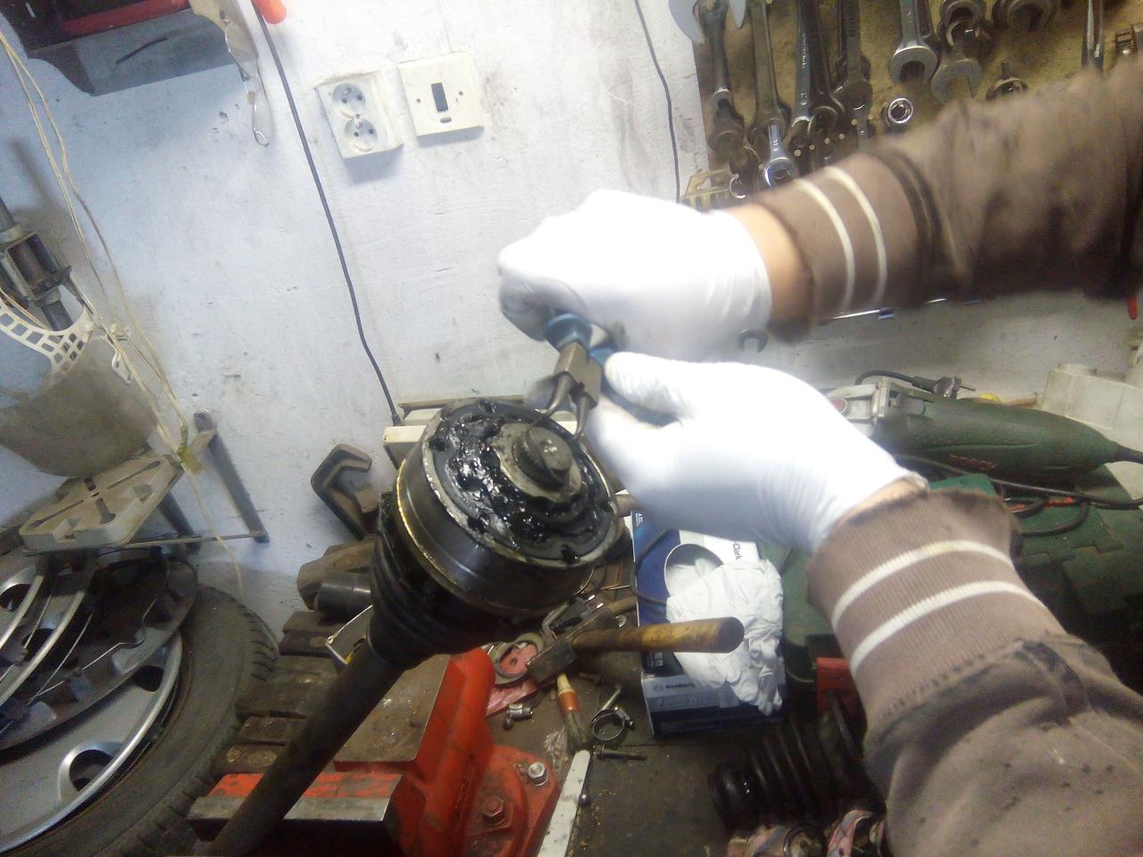 poloosu očistíme, dáme nový kloub,máznem vazelínou a zajistíme ségrovkou ted je třeba vrátit poloosu do auta,utáhnem jí u převodovky,nandáme jí do těhlice,nandáme spodní čep do ramene a utáhneme,uchytíme krycí plast motoru,