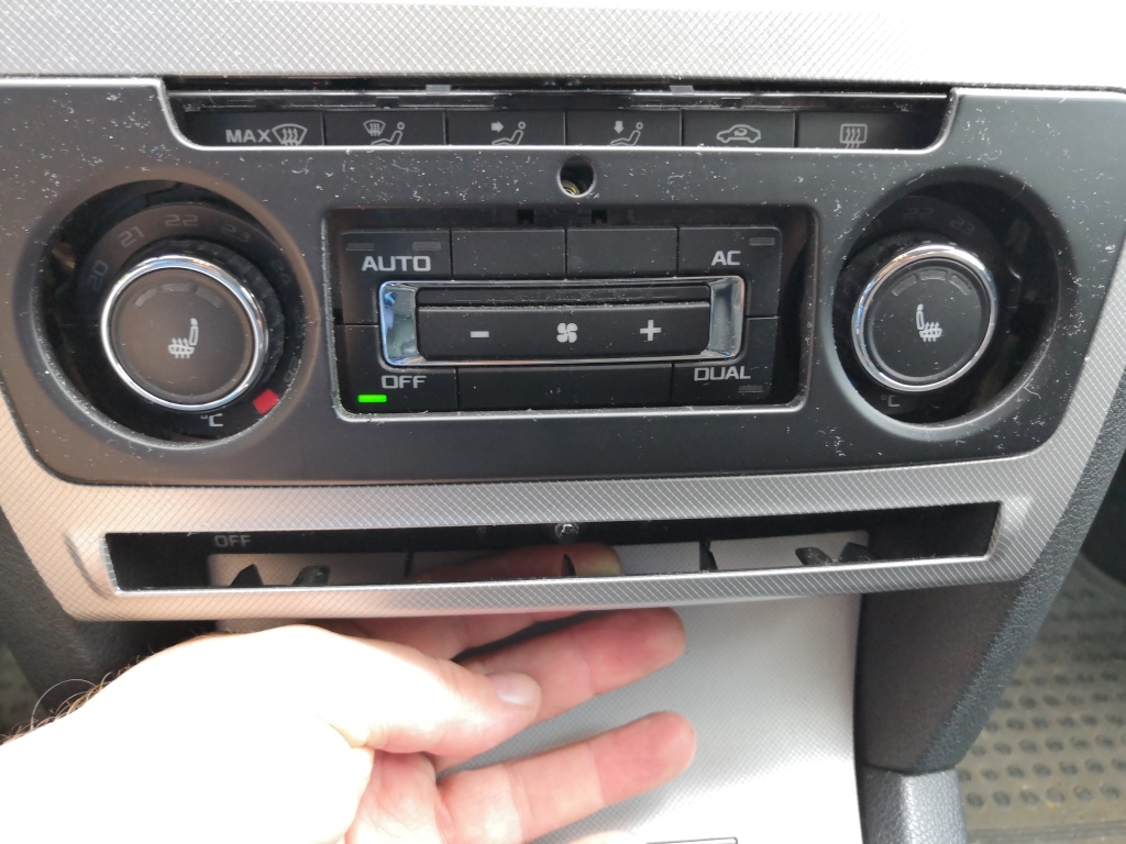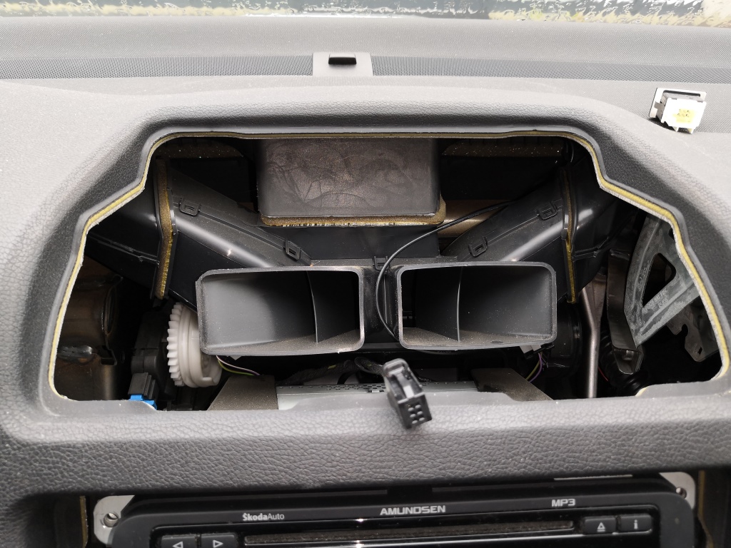 Ze spoda opatrně vycvakněte rámeček. Opatrně vycvakněte rámeček po stranách.A celý opatrně sejměte. Použijte hvězdičku T20. Odšroubujte 4x šrouby co drží navigaci. Opatrně odpojte kabel od rádio antény, kabel od GPS a konektor napájení, pozor všechny mají pojistky, tak odjistit a pak odpojit. Použijte nějakou hladkou slabou špachtličku a opatrně ji postupně nasuňte v tomto pořadí do spáry mezi palubovku a rámeček výdechu ventilace a lehce zatlačte a nadzvedněte v místě výdech ventilace. A tak postupujte u všech čtyř háčků a uvolněte výdech a pak jej vysuňte směrem k sobě a a je venku