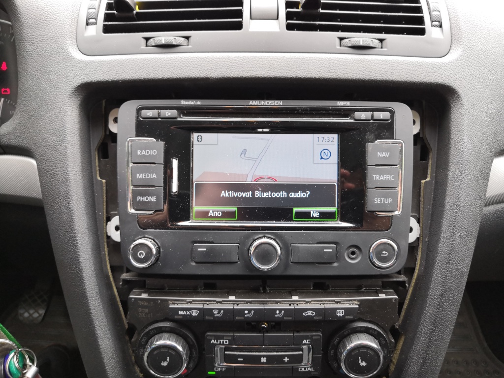 Vemte náhradu GPS anténu: 297103 FAKRA9 – AGP-103 GPS vnitřní anténa FAKRA 90°konektor Přilepte na modul oboustranou lepenku. Nalepte ji na horní část modulu. Protáhněte kabel kolem průduchu ventilace. Přilepte modul ze spoda na palubovku na rovný povrch, až za pozici kaslíku s výduchy. Modul musí být nalepen směrem vzhůru. Pokud ho nalepíte vzhůru nohama je to špatně a nebude snímat satelity.