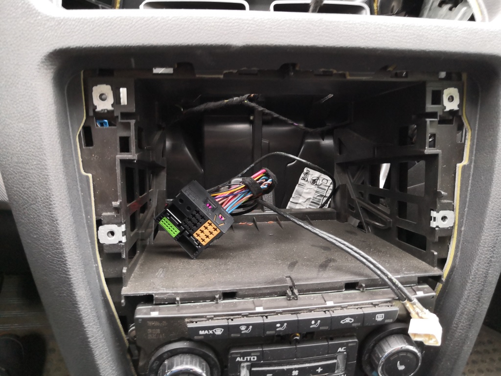 Připojte konektory od rádio antény, nového kabelu od GPS a konektor napájení. Starý konektor od GPS antény schovejte do palubovky. Usaďte navigaci zpět do panelu palubovky. Přišroubujte 4x šrouby zpět. Opatrně nasaďte mřížku od zhora a opatrně zamačkávajte směrem dolů a pak domáčkněte rámeček dole. A je hotovo.