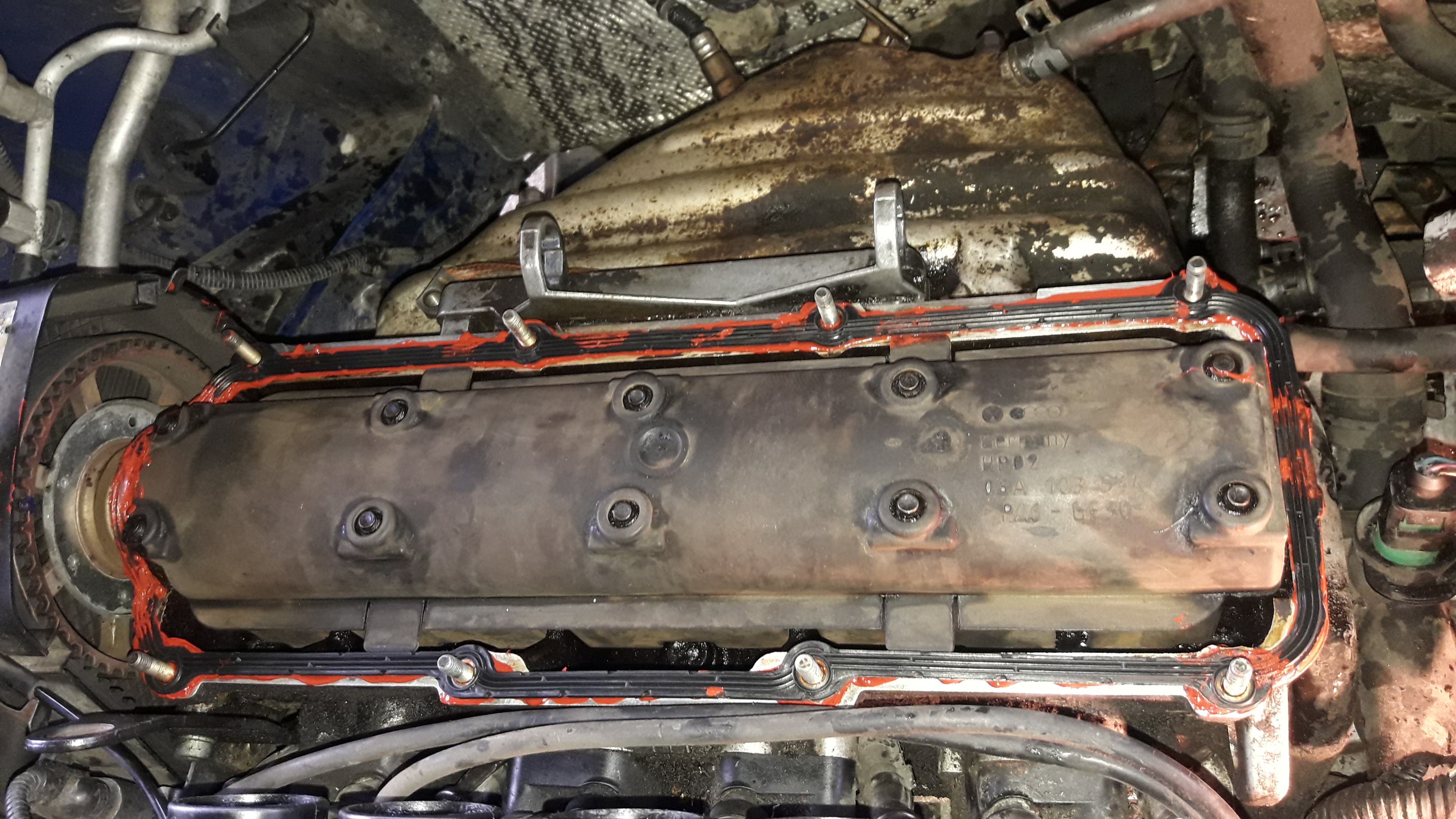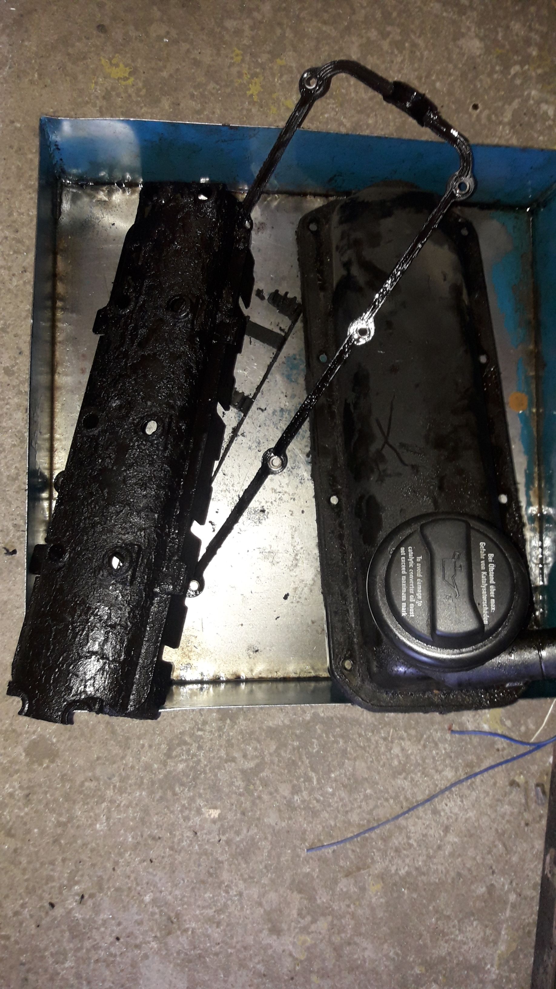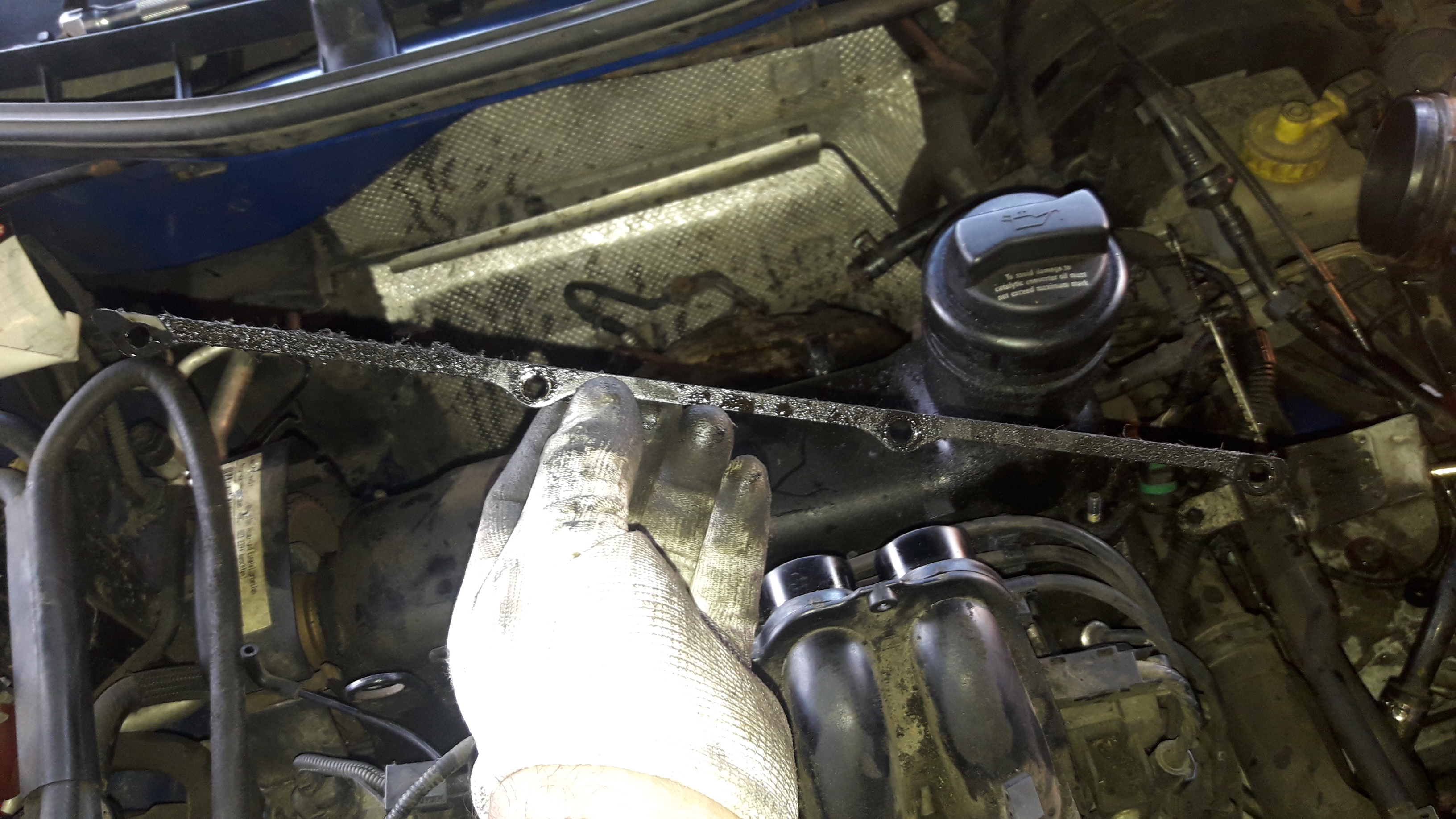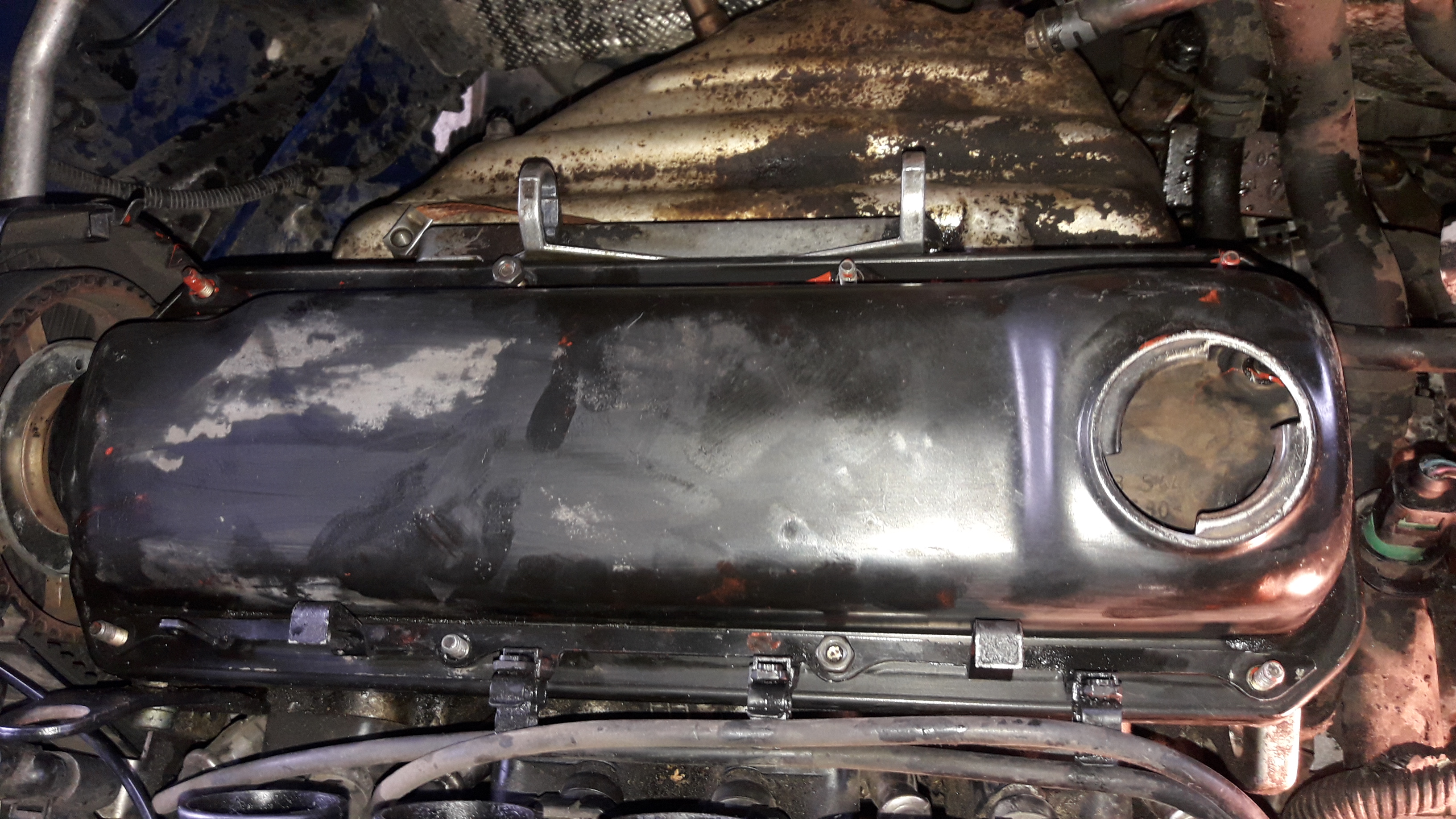 dále povolíme u strany rozvodů matky a sundáme plastový nástavec pro dekl rozvodú na druhý straně povolíme matky a sundáme držák pro plastovej dekl motoru povolíme zbytek matek co drží víko ventilů a sundáme obě výztuhy ted sundáme samotný víko ventilů pod ním je ještě plastový kryt ten sundáme taky ted je třeba vše důkladně vyčistit - víko ventilů včetně nalejvacího hrdla,plastovej kryt,dosedací plochu pro víko ventilů,držáky,výstuhy a vše co okolo uznáte za vhodné