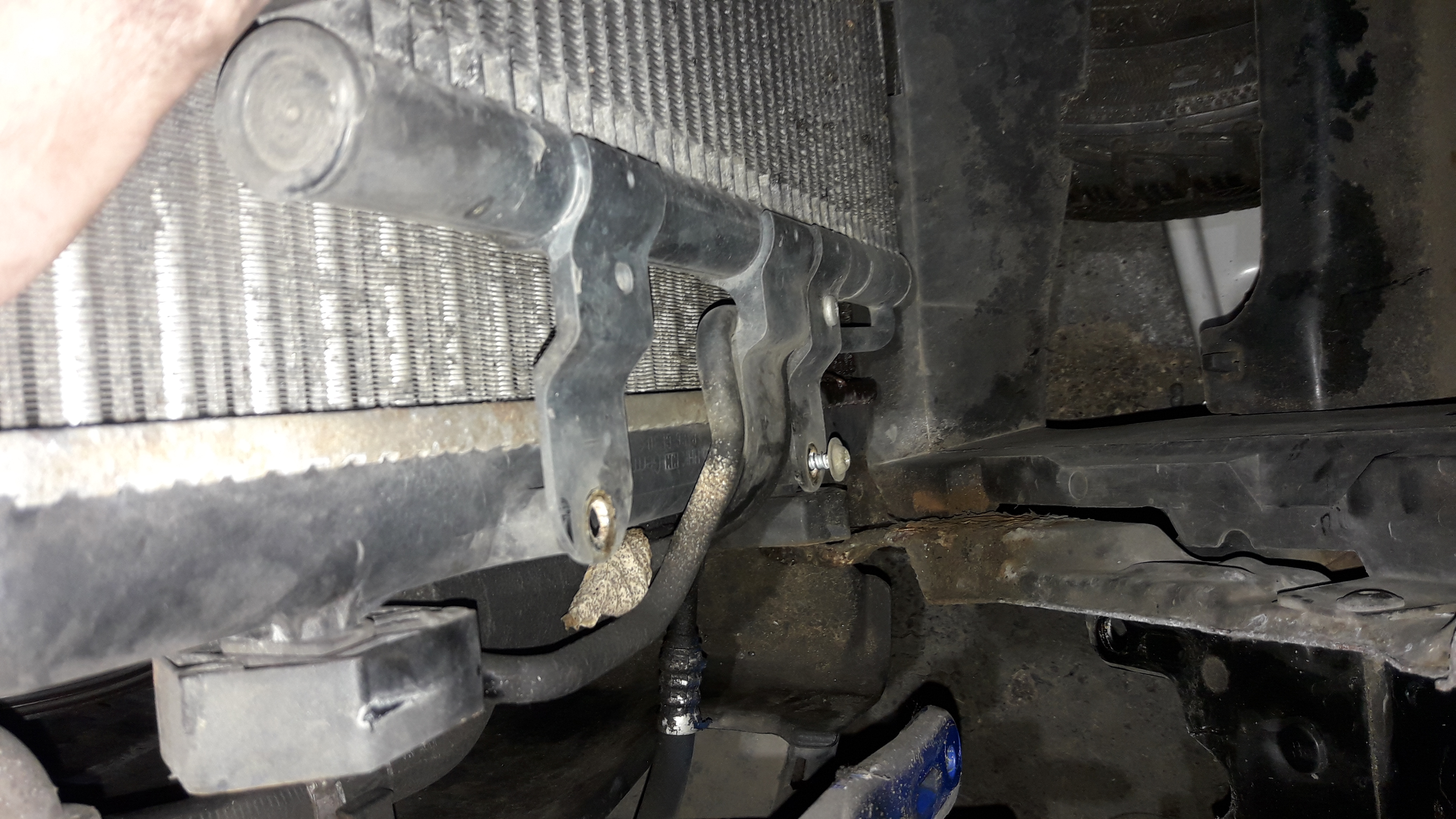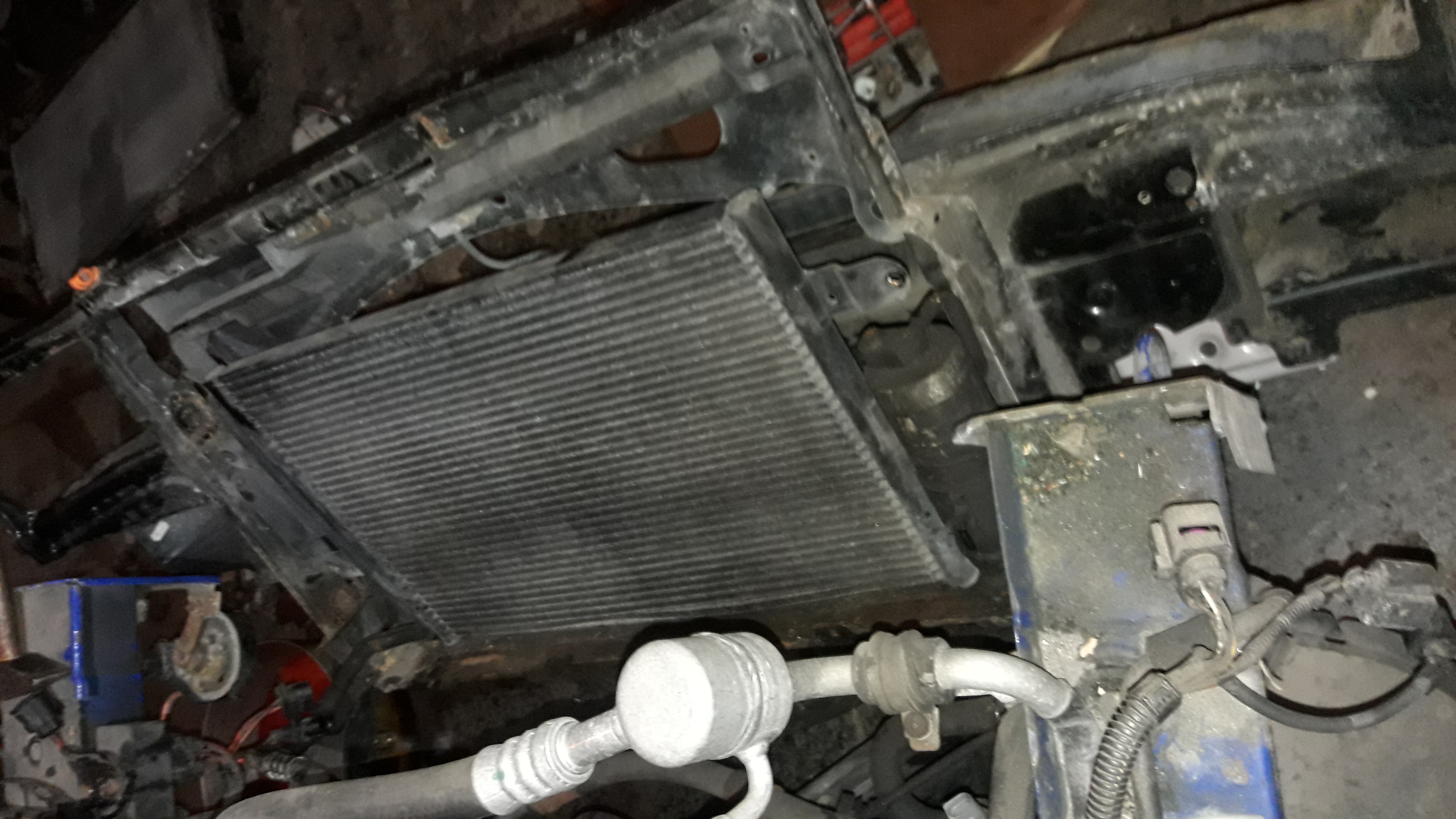 z nového chladiče demontujem tu záslepku a namontujem spínač ted si ze starého chladiče stáhnem všechny 4 gumový silenty a nandáme na novej chladič ted si novej chladič namontujem do auta: