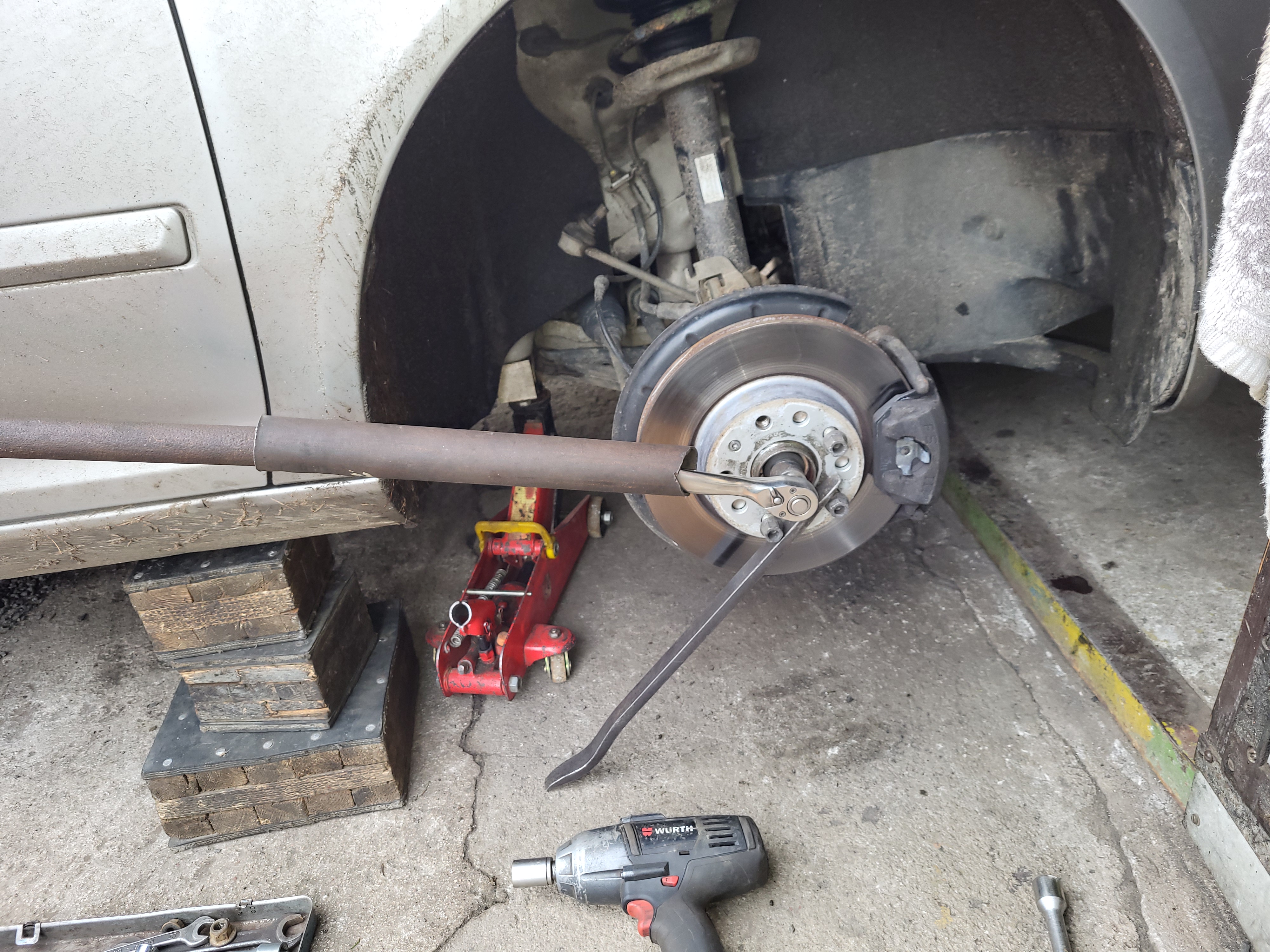 ja si vyhák z držáku těhlice brzdovou hadičku a kablík od ABS vytlacil homokloub z těhlice a vyndal spodní čep z ramene