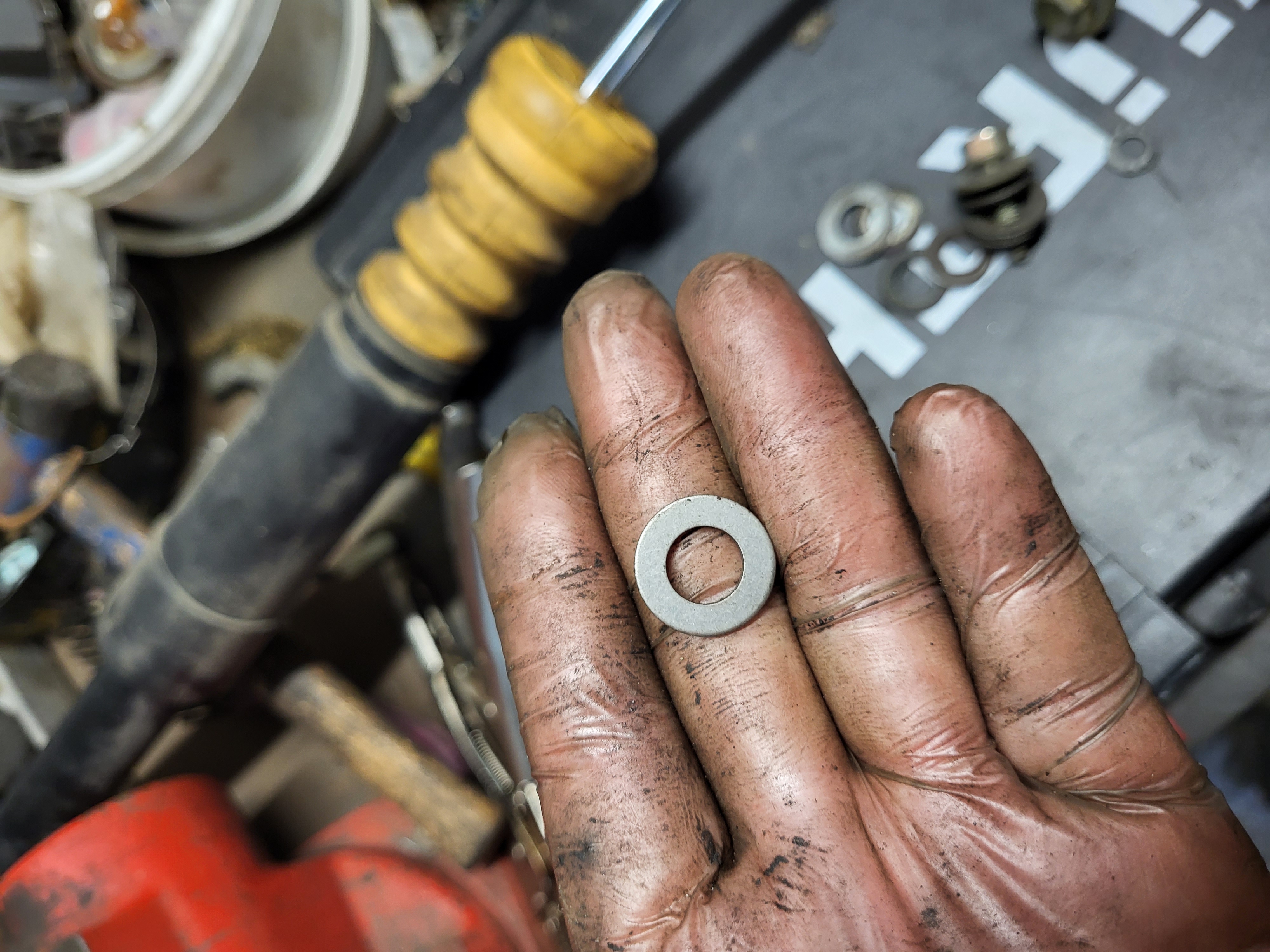 takže povolit kolo zvednout podložit tak aby to na nas nespadlo sundat kolo demontujem zadní tlumič demontujem horní uložení problém je v tom že na tom tlumiči je zarážka v podobě pérovky a to je dle mě prostě málo takže sem vzal silnější kovovou podložku poupravil tak aby šla na tlumič a vešla se i do vnitřku toho uložení namontujem uložení i s podložkou a jednu podložku sem dal i z vrchu pod matku a řádně dotáhl tlumič namontujem zpět do auta dáme kolo utáhnem a uděláme to samé i na druhém zadním tlumiči