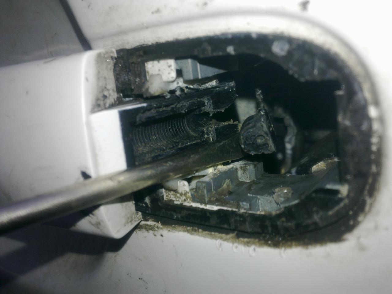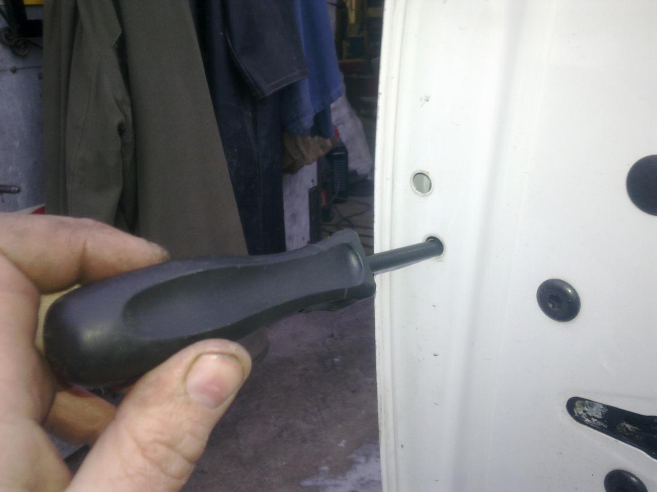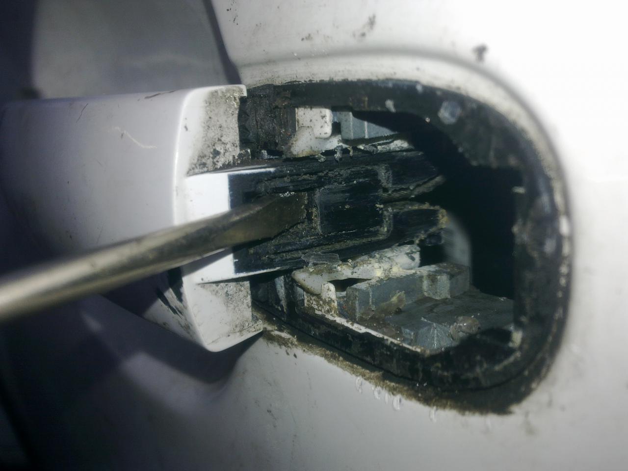 poté co ho vyháknem odpojíme bovden vnitřní kliky a tapec dáme stranou ted kapka prevence najdem konektor od ŘJ okna vycvaknem,zkontrolujem,očistíme a prostříkneme kontakty ted si odstraníme nalepenou vodětěsnou zábranu jenž kryje otvor pod nímž je uvnitř dveří zámek a vycvaknem konektor od zámku centrálu ted si z boku dveří vyloupnem obě záslepky a vrchní šroub vytočíme a spodní pouze povolíme-pozor nezkoušet ho ůplně vytočit nejde to