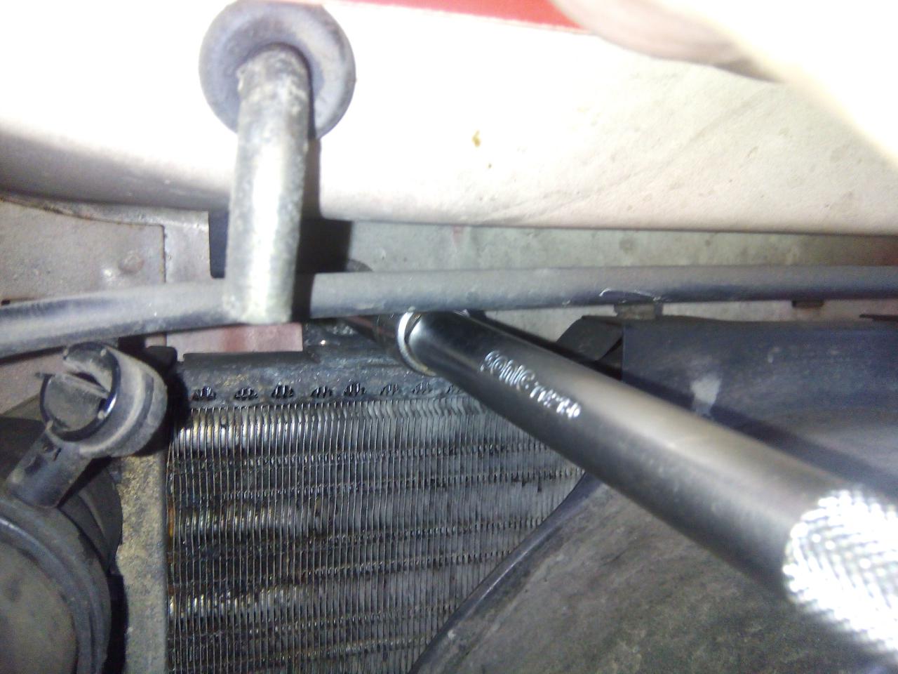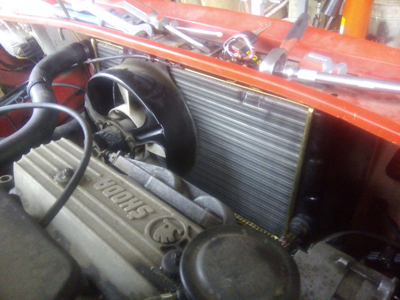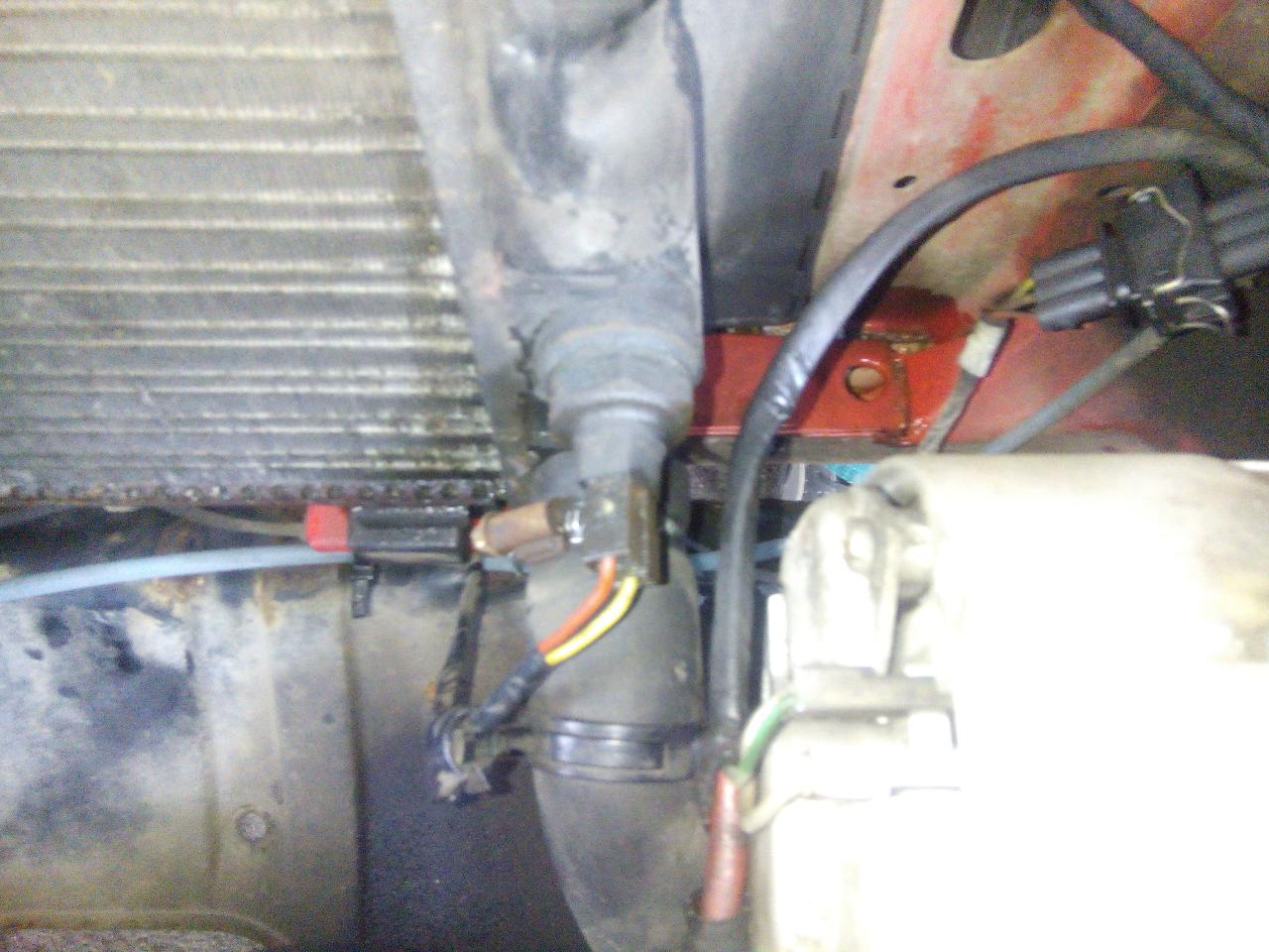 dále přehodíme i čidlo spínání ventilátoru,popřípadě i hadici na vodu pokud bychom jí sundali u termostatu a né s chladiče ted je třeba chladič namontovat zpět do vozu- dole nasadíme do silentbloků a nahoře uchytíme na oba šrouby a utáhneme dále nasadíme a zajistíme sponou všechny hadice ,nacvaknem konektor na čidlo na chladiči a na ventilátor ted si nalejem do expanzky směs vody a nemrznoucí kapaliny,natočíme auto,necháme ohřát do otevření termostatu -poznáme tak že je horkej komplet celej chladič či nám sepne ventilátor na chladiči a poklesne hladina vody v expanzní nádobce vodu dolejeme a máme hotovo