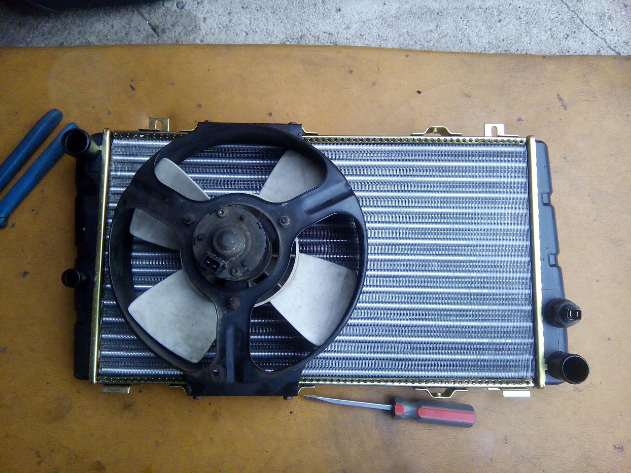 ted vyndáme chladič s auta a připravýme chladič nový demontujem ze starého chladiče ventilátor a namontujem na chladič nový
