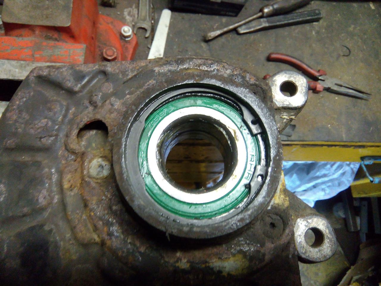 osmirglujem,očistíme,máznem vazelínou a nalisujem nové ložisko-nelisujem za střed ložiska došlo by k jeho poškození a výraznému zkrácení životnosti ložiska :pozor: