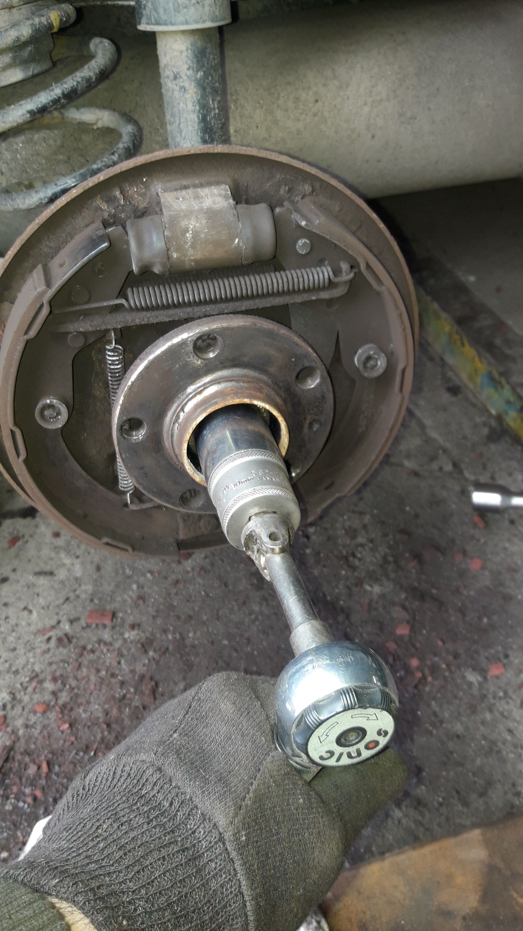 ted zlehka máznem trn těhlice a nandáme náboj kola a utáhneme poté vemem nové čidlo já mu tělo lehce máznu vazelínou a namontuju ho - máznu grafitkou i závit šroubu co ho drží poté nacvaknu konektor a zkontrolujem zda čidlo nedrhne o ABS kroužek dále nastavíme klínek samostavu tak aby šel brzdový buben kapku z tuha nasadit
