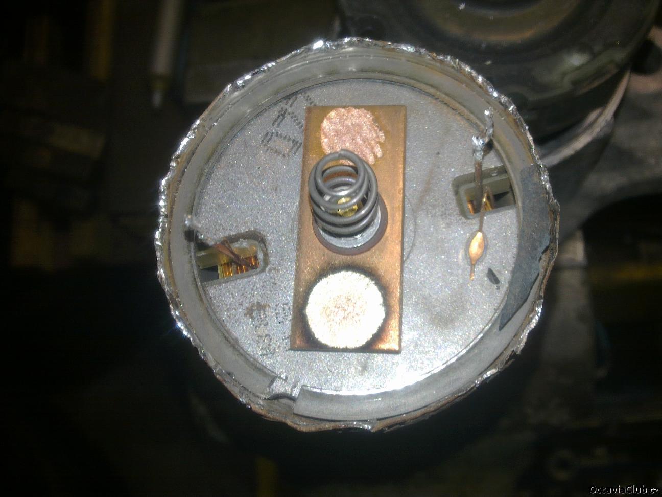 opilujem opálený kontakty ve víku cívky,opilujem i pohyblivý měděný kontakt a ten mírně napružíme -přiohnem já to dám do svěráku sundám pružinku a mírně z vrchu klepnu na tu vodící osičku ,poté cívku opět složíme nezapomenem na pružinku,zapertlujem a zaletujem řádně oba spoje,ještě než to složíme můžem si závitníkem protáhnout závity obou šroubů a očistíme dosedací plochy obou šroubů :thumb: