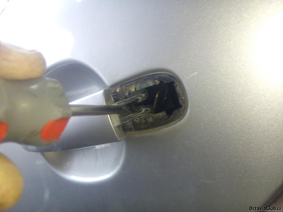 aby šel zámek vyndat musíme si do dveří zatlačit gumovou krytku a bovden ovládání od vnitřní kliky