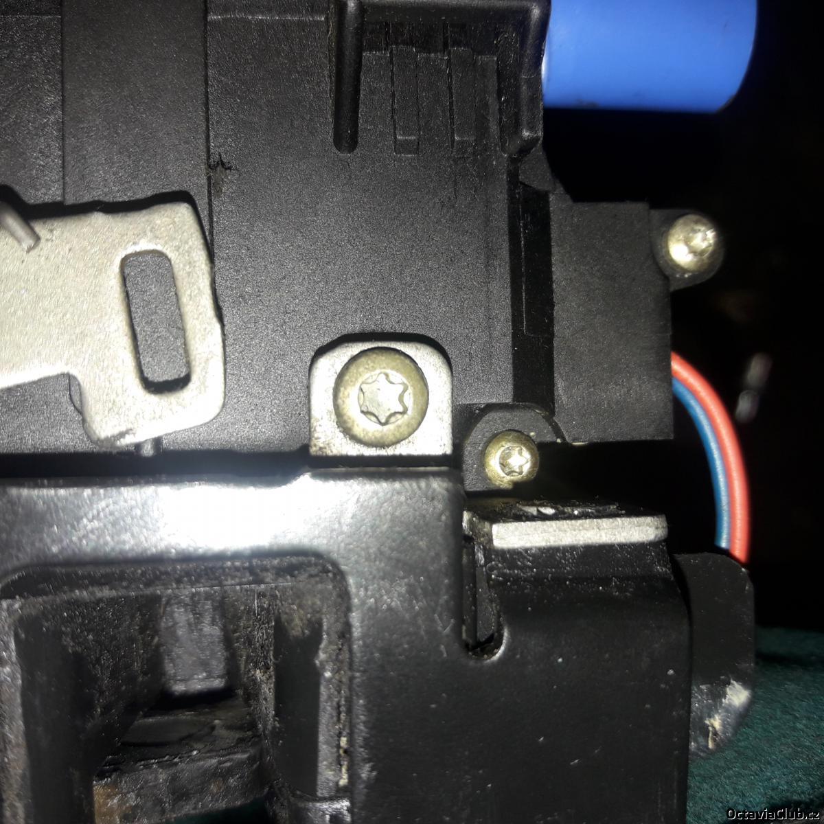 odjistit pružinu povolit oba šroubky co drží k sobě elektrickou a mechanickou část zámku viz foto: vycvaknem obě umělohmotná zajištění a vyndáme elektrickou část z té mechanické -zůstane to pouze propojené kabelem od mikrospínače co je na mechanické části zámku ted je třeba rozebrat tu elektrickou část zámku,povolíme všechny torxi co drží ten vrchní dekl dekl sundáme uvnitř je tištěný spoj,náká ta umělohmotná táhla a dva motorky ted je otázkou kterej z nich odešel, nebo jen zlobí
