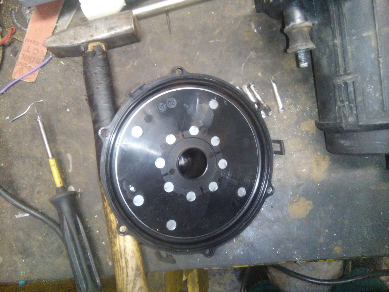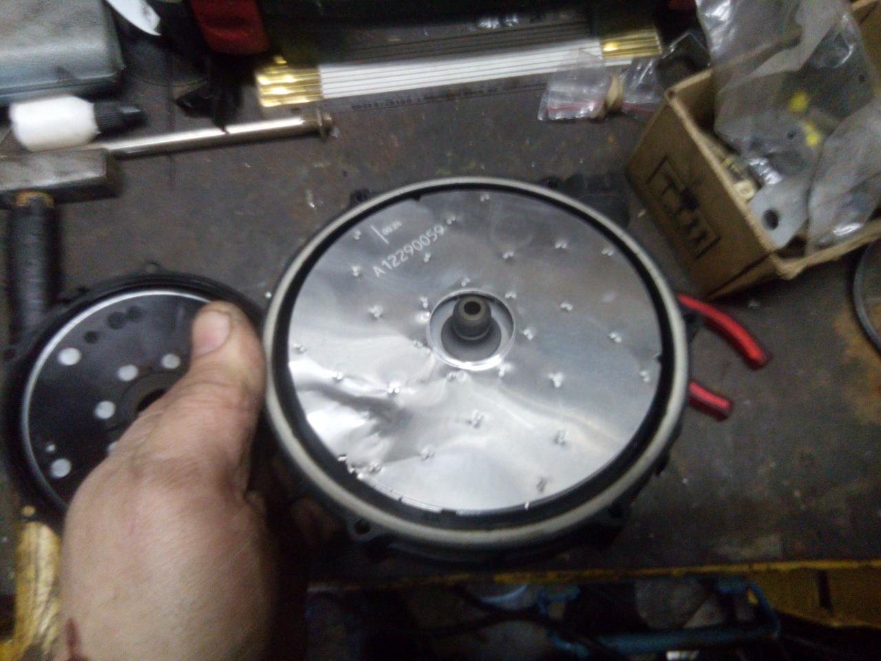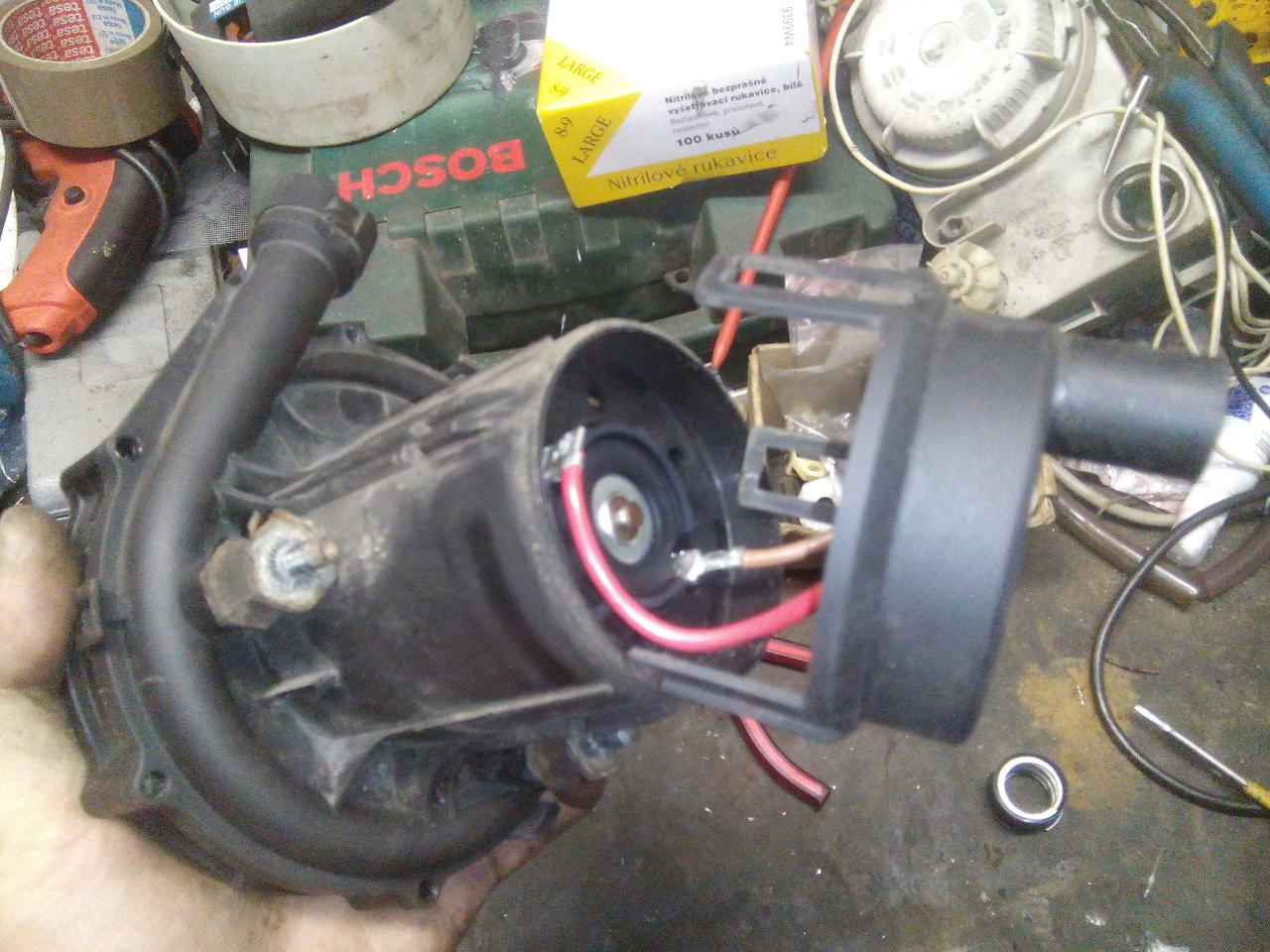je třeba odvrtat a vytáhnout hliníkový nejty poté vycvaknem to vrchní víko vývěvy bylo vidět že to trochu odnesla i samotná vrtulka, chtěl sem to celý rozebrat ale nepodařilo se mi povolit tu vrchní matku,