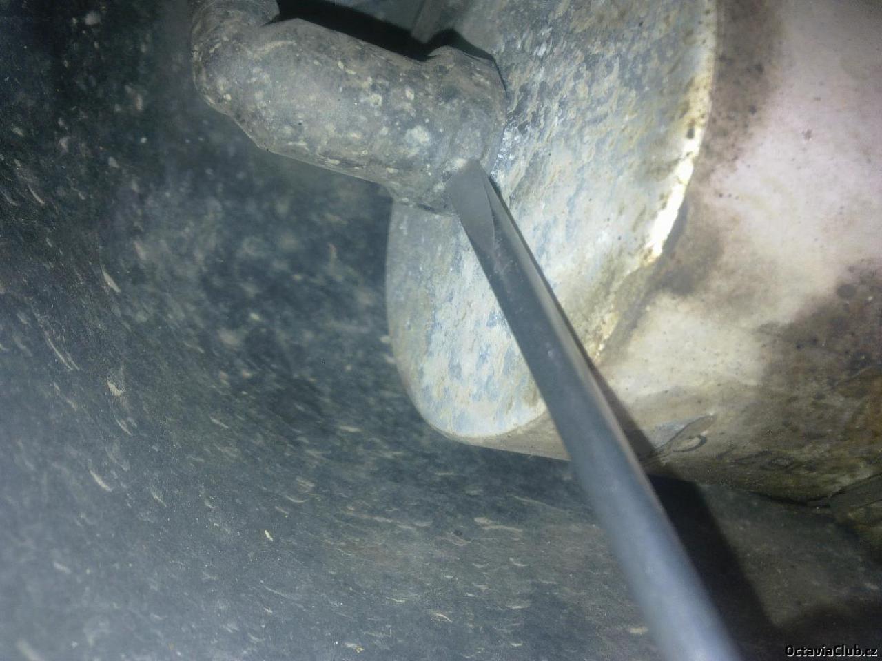 poté necháme vytéct benzín do nádoby pod autem pak si filtr vysunem s objímky a vycvaknem sponu na druhý straně filtru a vytáhnem hadici starý filtr zahodíme a dáme nový pozor na směr montáže filtru