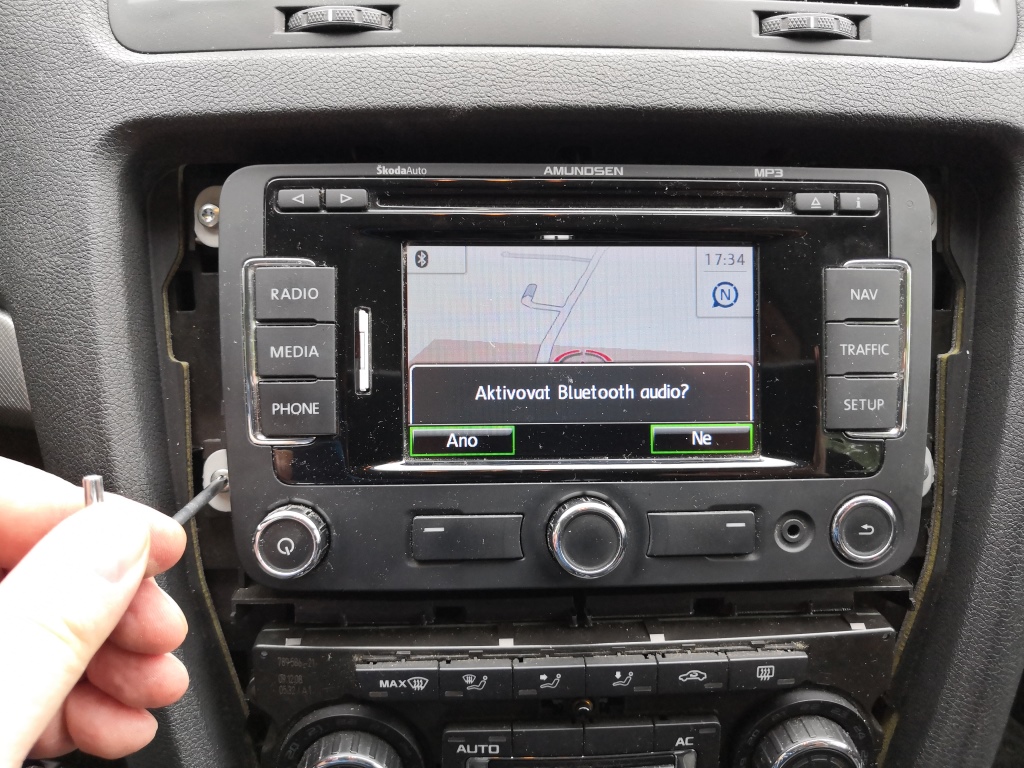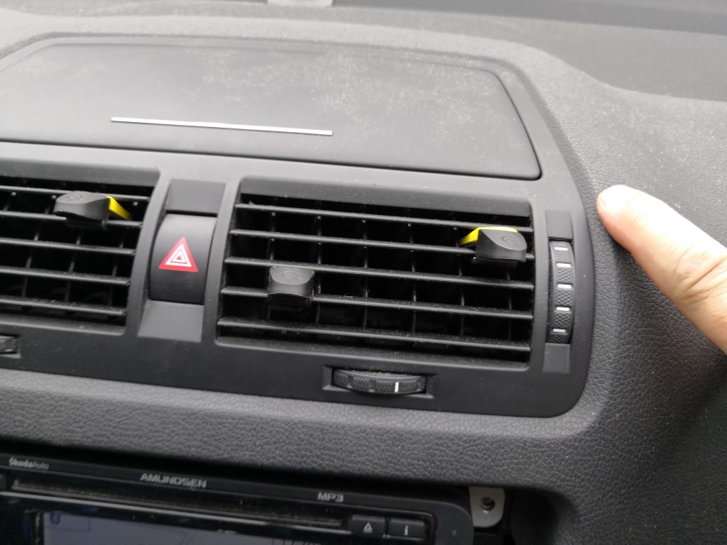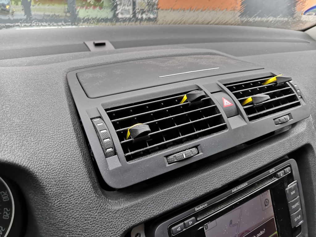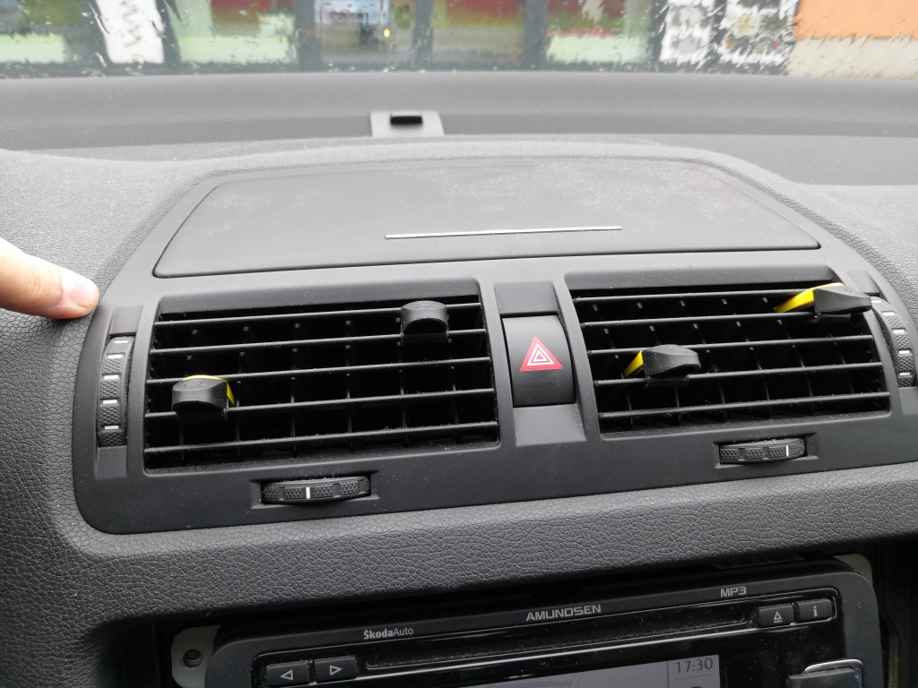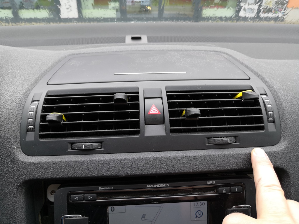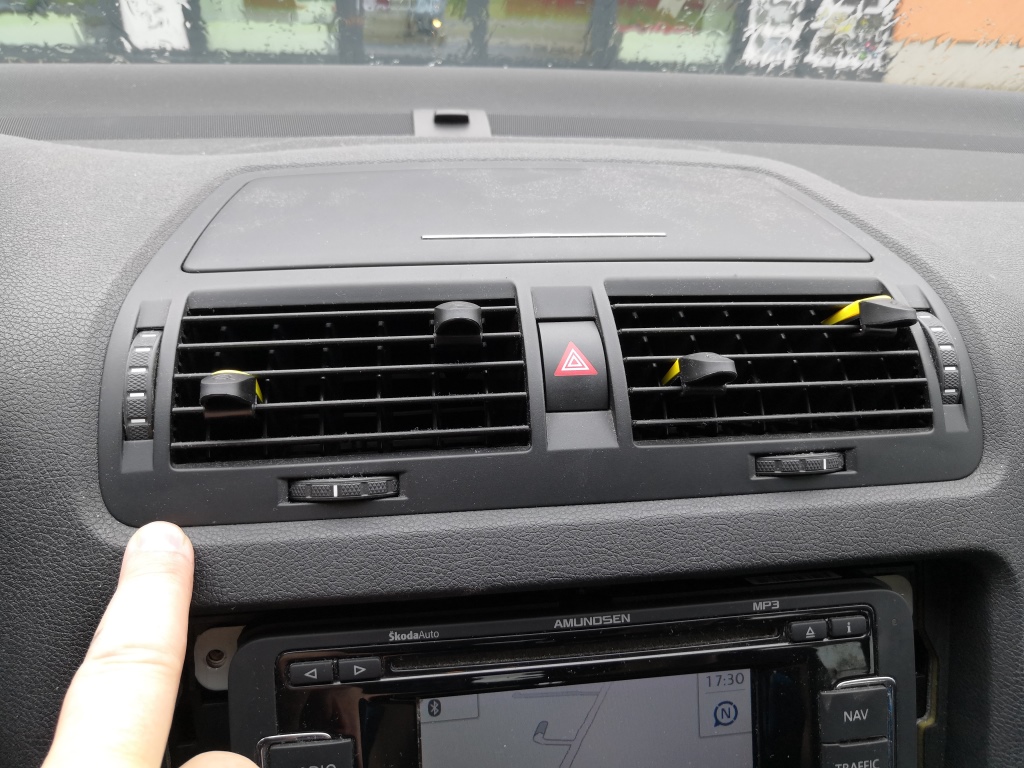 Ze spoda opatrně vycvakněte rámeček. Opatrně vycvakněte rámeček po stranách.A celý opatrně sejměte. Použijte hvězdičku T20. Odšroubujte 4x šrouby co drží navigaci. Opatrně odpojte kabel od rádio antény, kabel od GPS a konektor napájení, pozor všechny mají pojistky, tak odjistit a pak odpojit. Použijte nějakou hladkou slabou špachtličku a opatrně ji postupně nasuňte v tomto pořadí do spáry mezi palubovku a rámeček výdechu ventilace a lehce zatlačte a nadzvedněte v místě výdech ventilace. A tak postupujte u všech čtyř háčků a uvolněte výdech a pak jej vysuňte směrem k sobě a a je venku