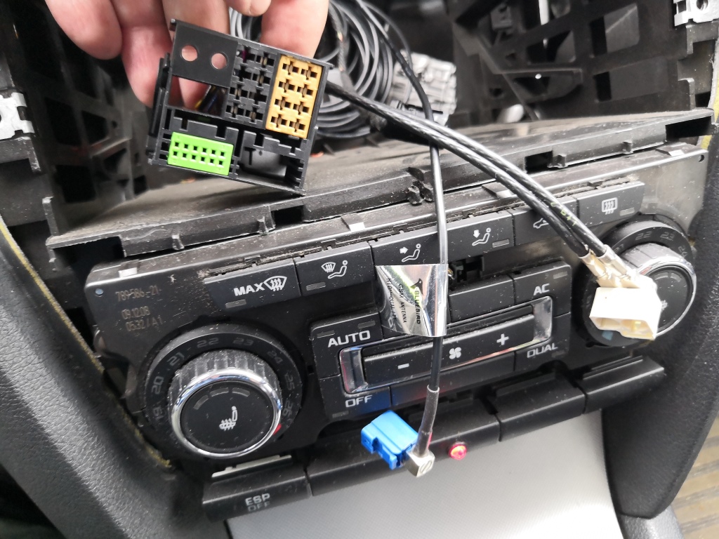 Připojte konektory od rádio antény, nového kabelu od GPS a konektor napájení. Starý konektor od GPS antény schovejte do palubovky. Usaďte navigaci zpět do panelu palubovky. Přišroubujte 4x šrouby zpět. Opatrně nasaďte mřížku od zhora a opatrně zamačkávajte směrem dolů a pak domáčkněte rámeček dole. A je hotovo.