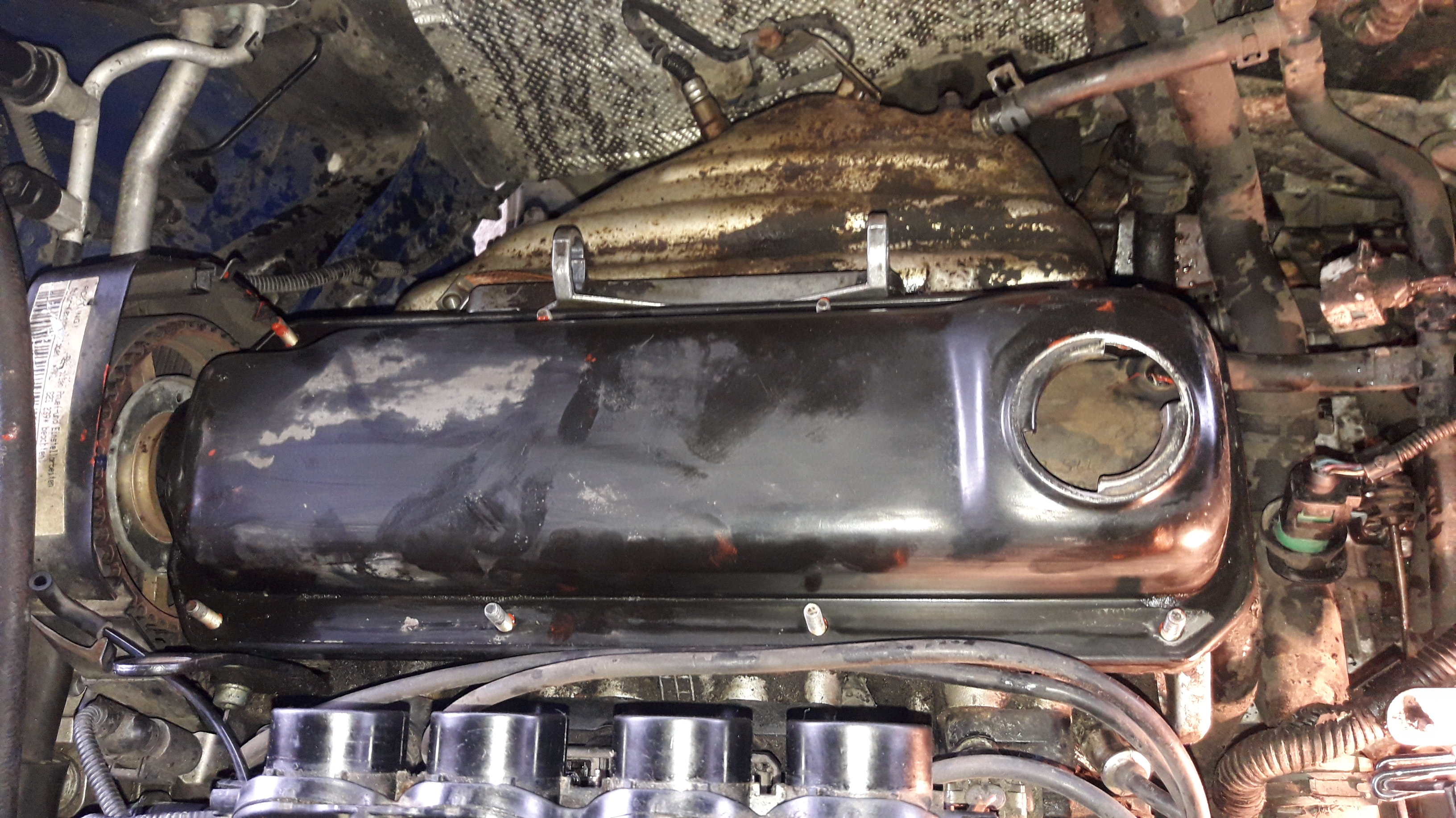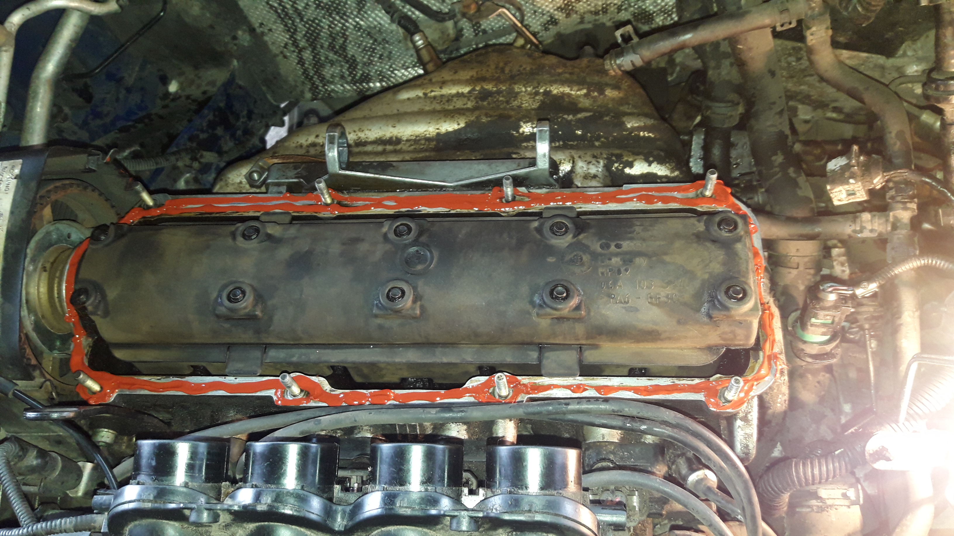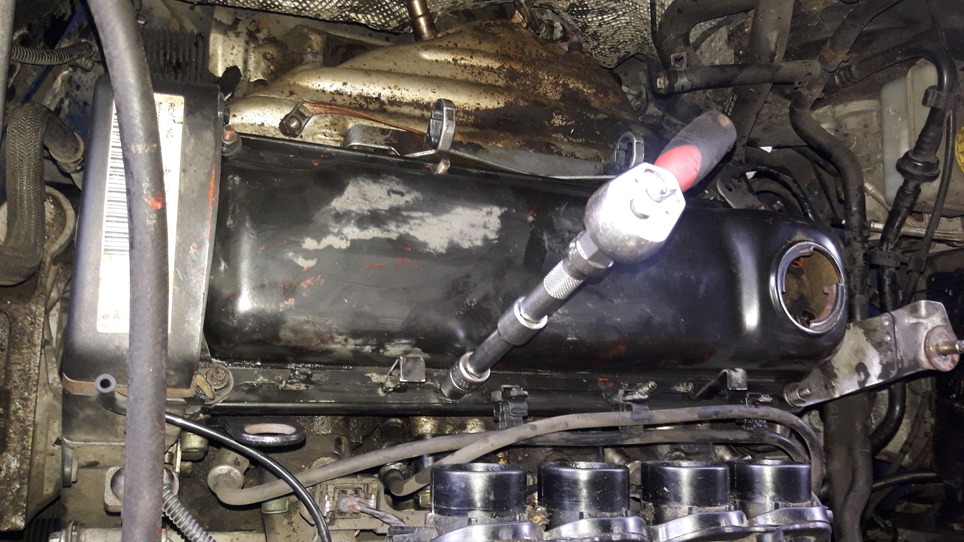 dále povolíme u strany rozvodů matky a sundáme plastový nástavec pro dekl rozvodú na druhý straně povolíme matky a sundáme držák pro plastovej dekl motoru povolíme zbytek matek co drží víko ventilů a sundáme obě výztuhy ted sundáme samotný víko ventilů pod ním je ještě plastový kryt ten sundáme taky ted je třeba vše důkladně vyčistit - víko ventilů včetně nalejvacího hrdla,plastovej kryt,dosedací plochu pro víko ventilů,držáky,výstuhy a vše co okolo uznáte za vhodné
