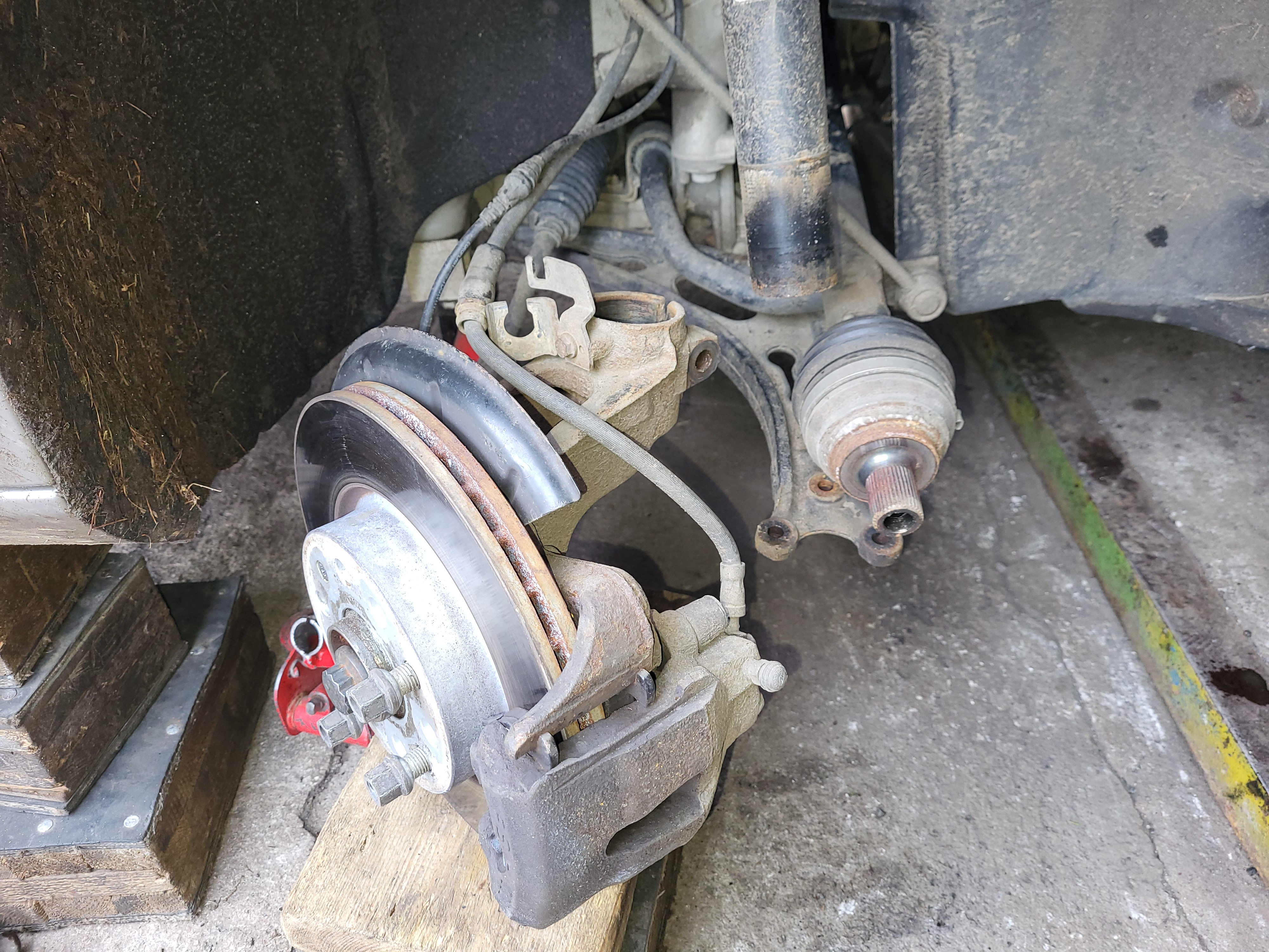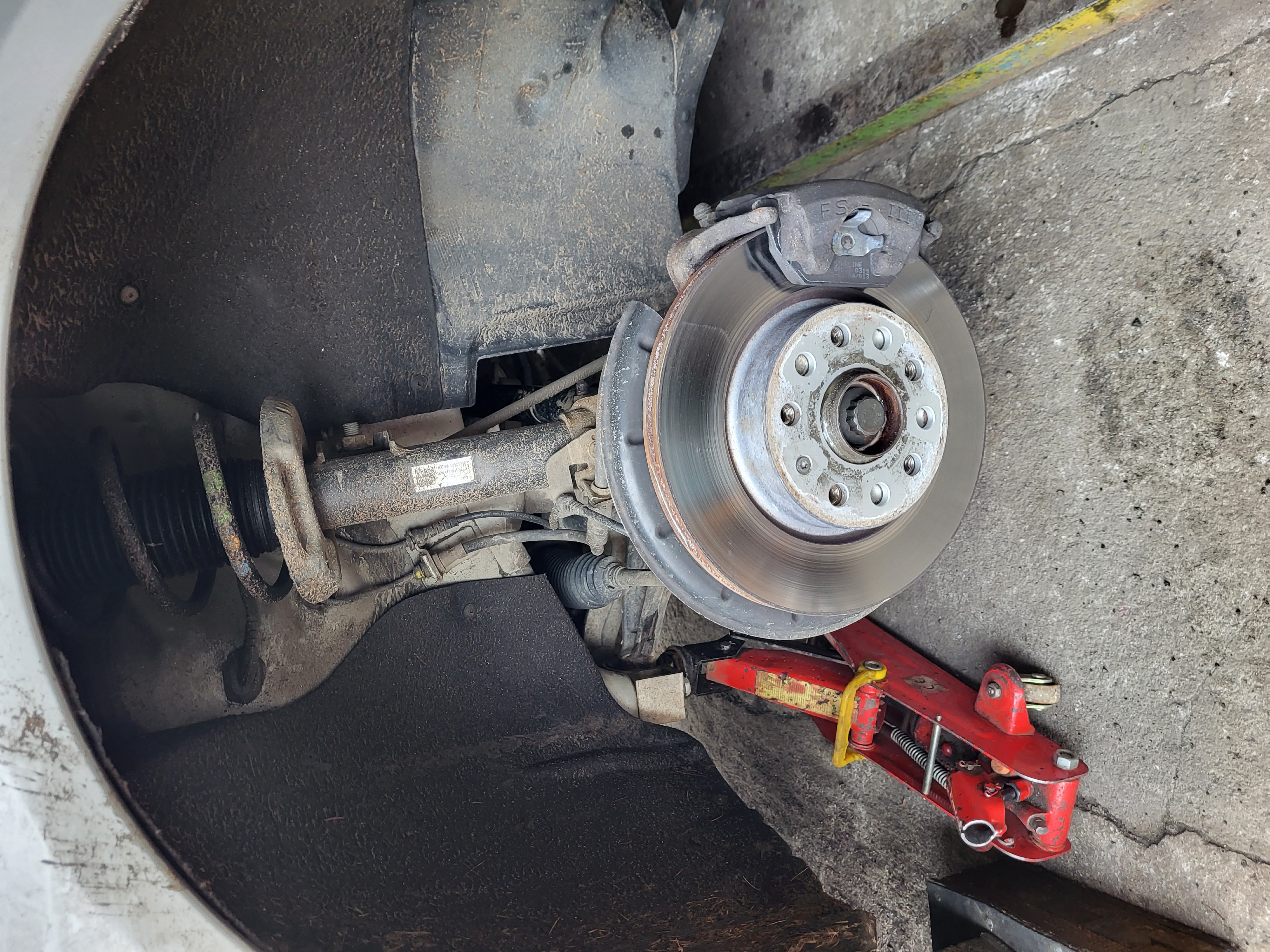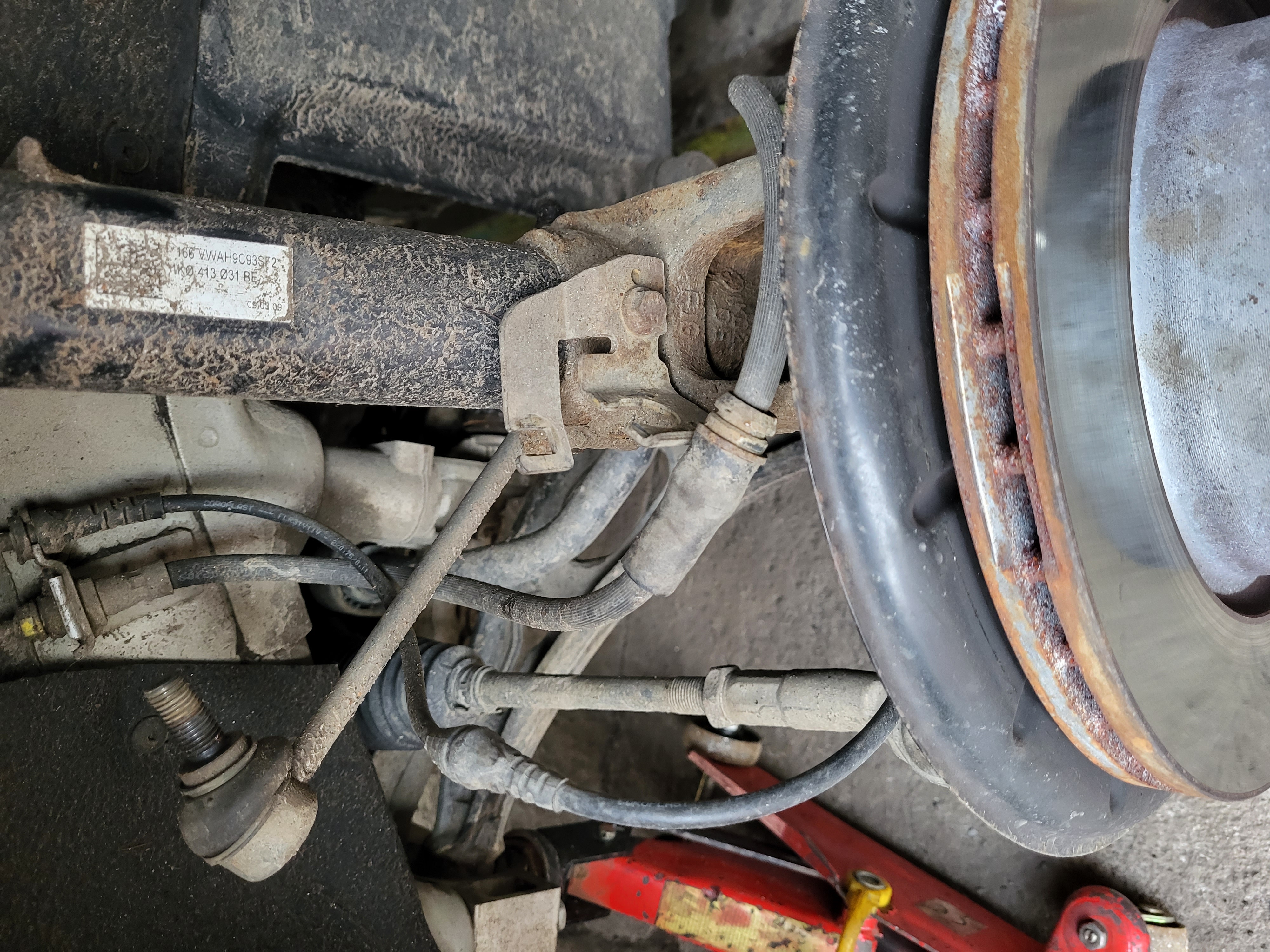 nasunem těhlici a zajistíme novým šroubem který opět namažem vazelínou a utáhnem ted je třeba nandat homokloub do těhlice a nasadit a utáhnout spodní čep do ramene utáhneme si i šroub co drží homokloub v těhlici namontujem stabilizační tyčku nandáme do držákú brzdovou hadičku a kablík od ABS zkontrolujem zda sme na nic nezapoměli vše správně dotáhli nandáme a utáhnem kolo sundáme z heveru a dem měnit tlumič na druhé straně