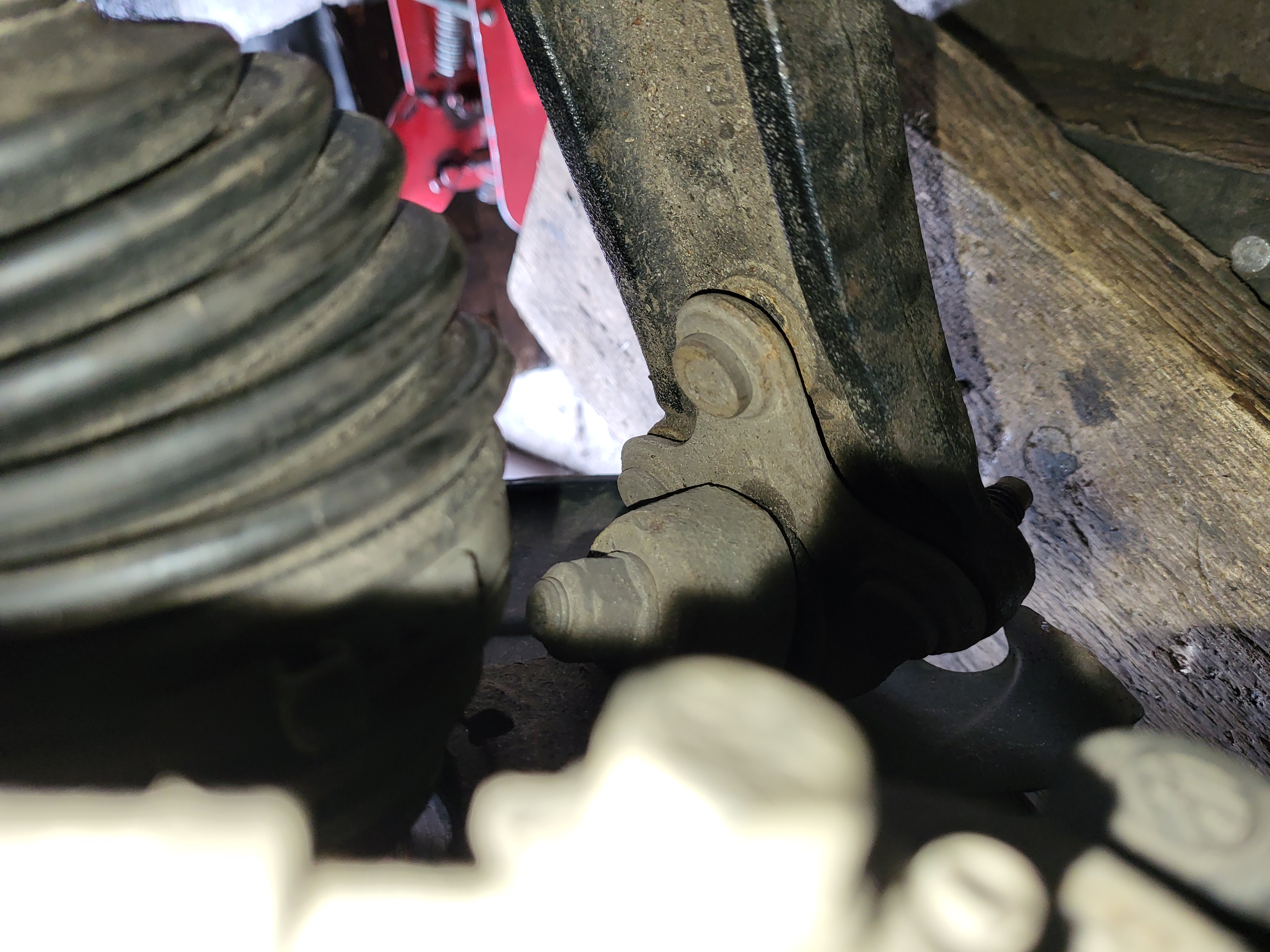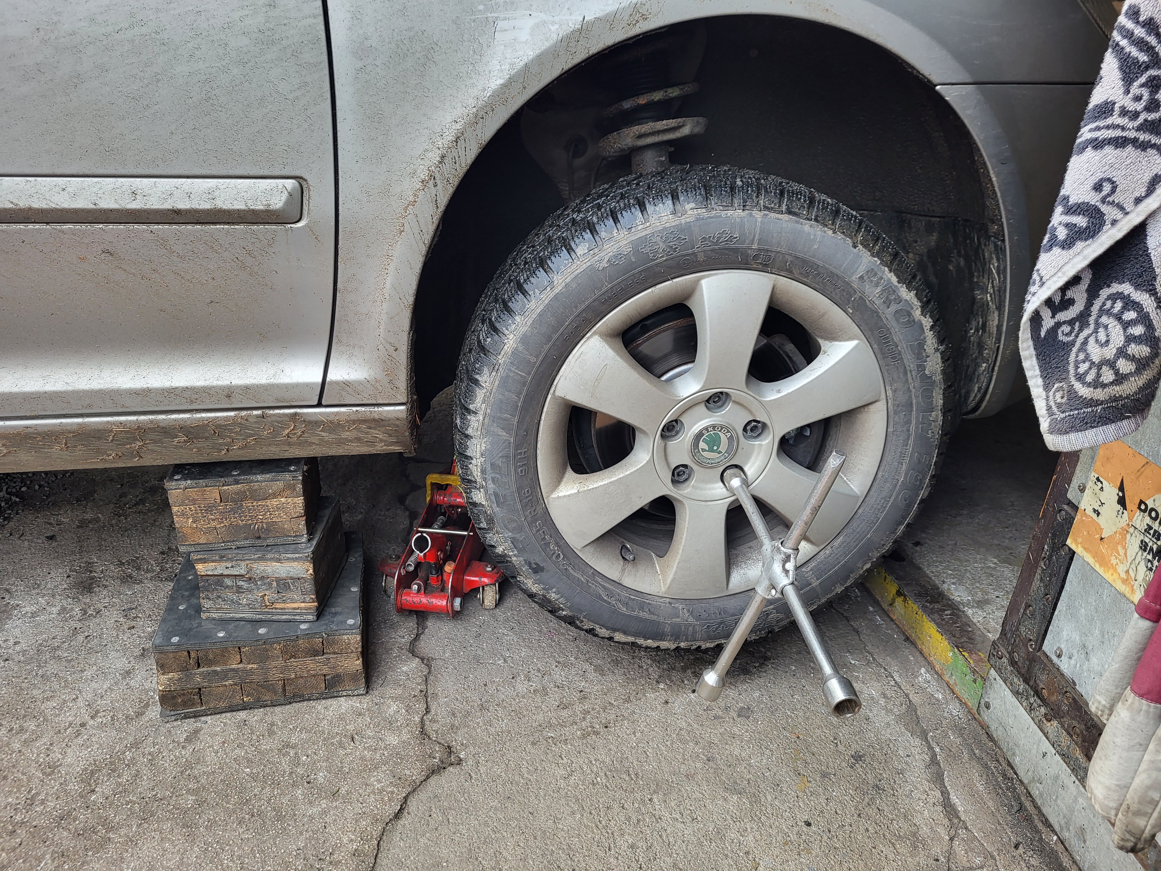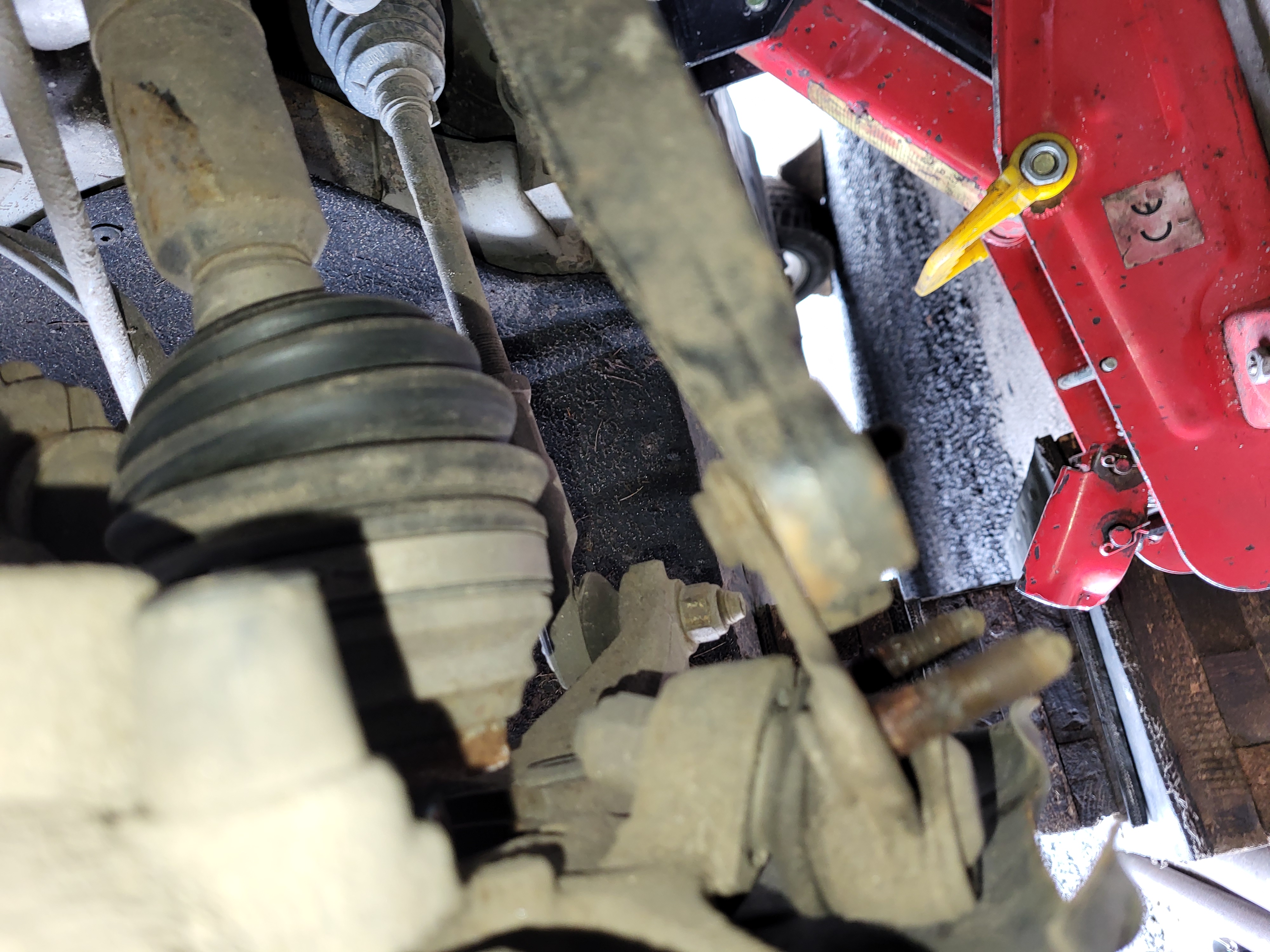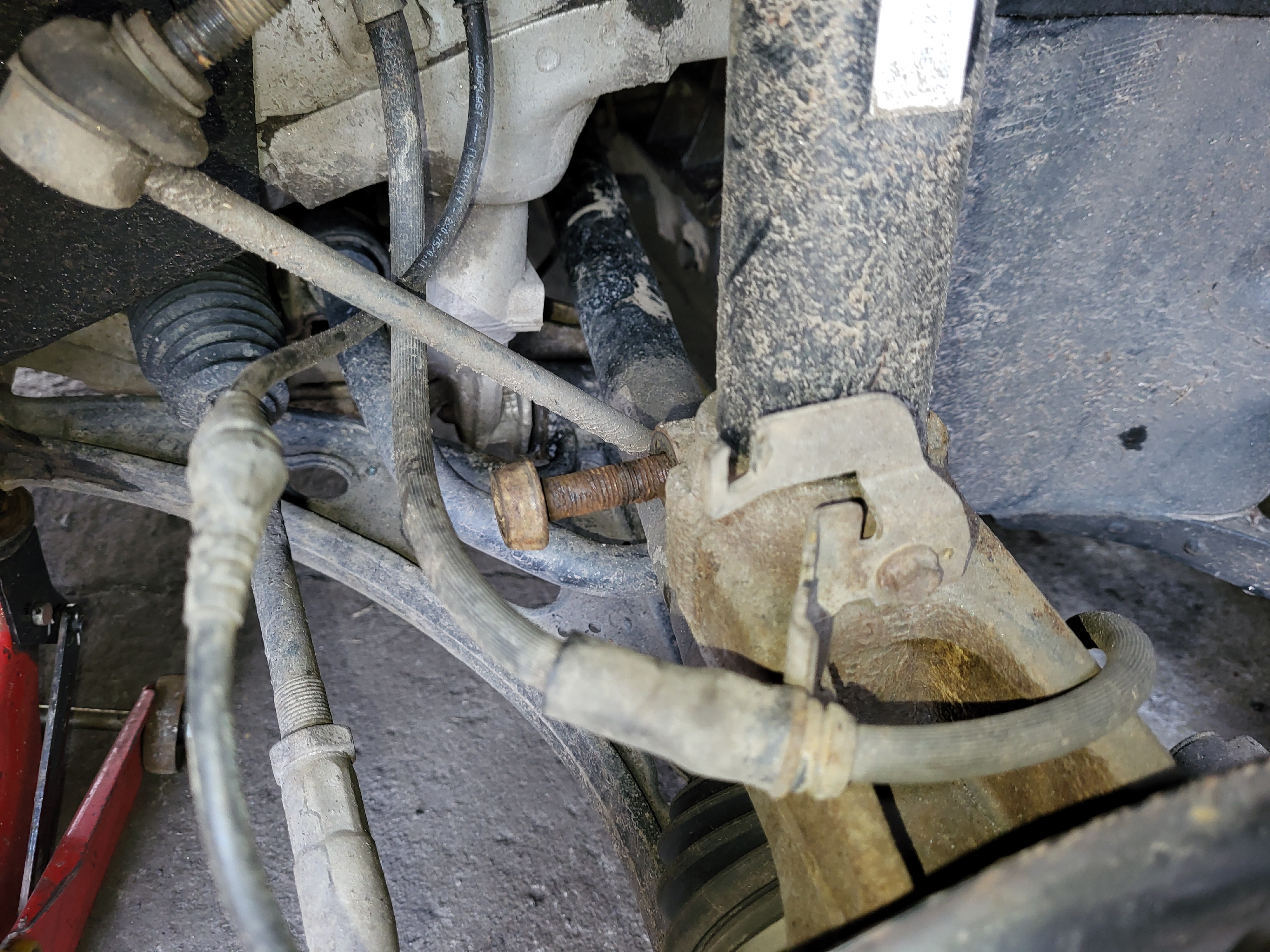 nasunem těhlici a zajistíme novým šroubem který opět namažem vazelínou a utáhnem ted je třeba nandat homokloub do těhlice a nasadit a utáhnout spodní čep do ramene utáhneme si i šroub co drží homokloub v těhlici namontujem stabilizační tyčku nandáme do držákú brzdovou hadičku a kablík od ABS zkontrolujem zda sme na nic nezapoměli vše správně dotáhli nandáme a utáhnem kolo sundáme z heveru a dem měnit tlumič na druhé straně
