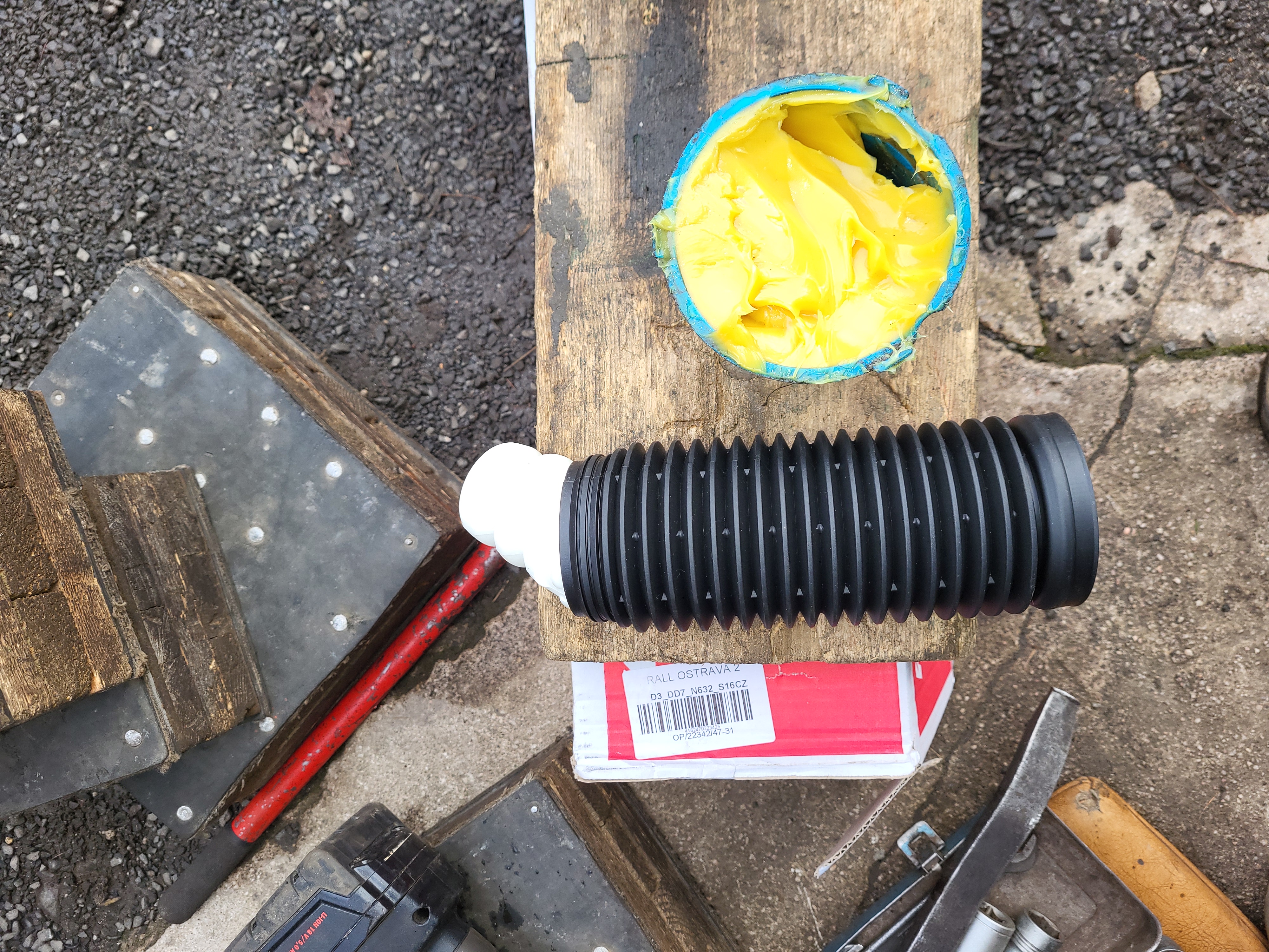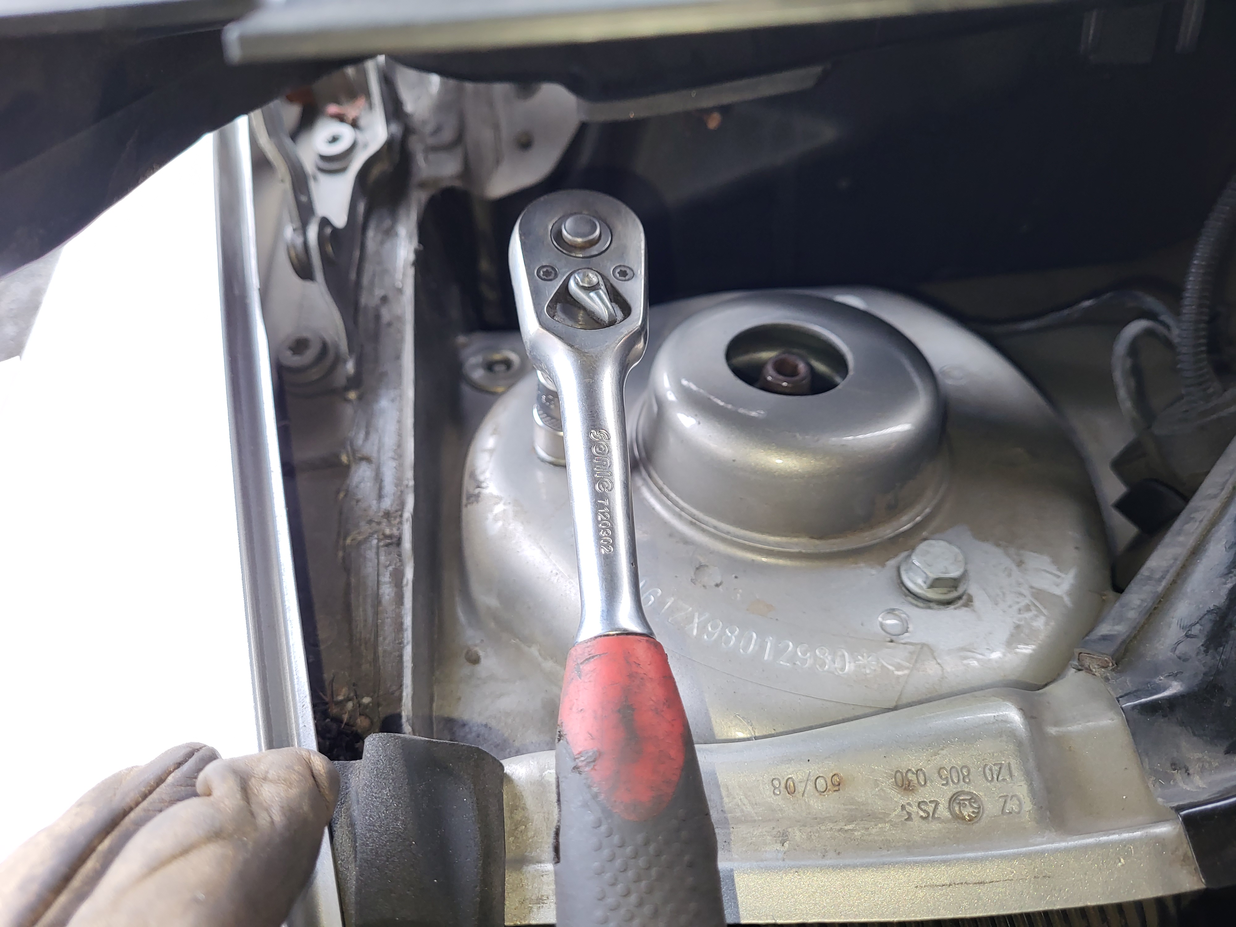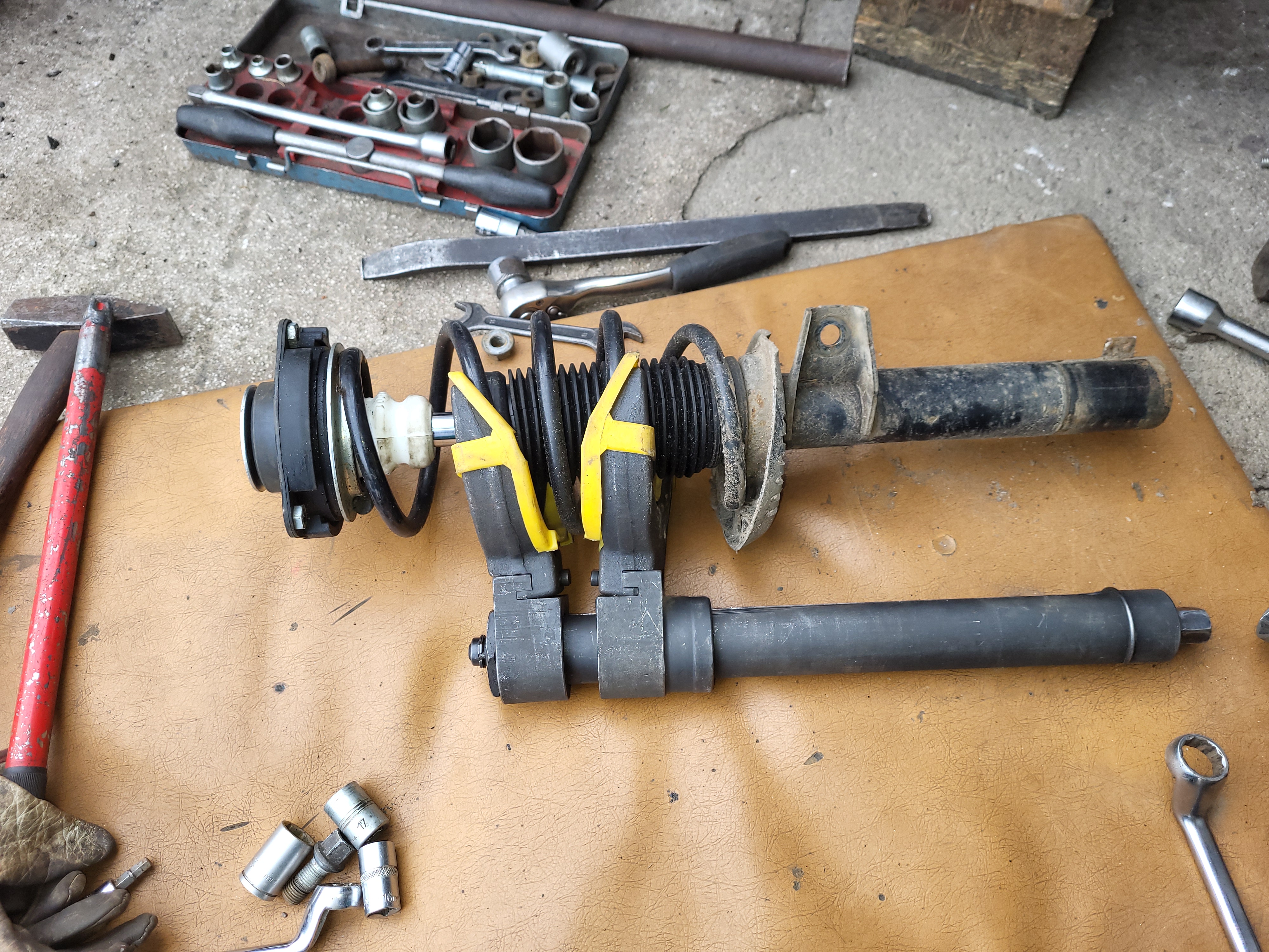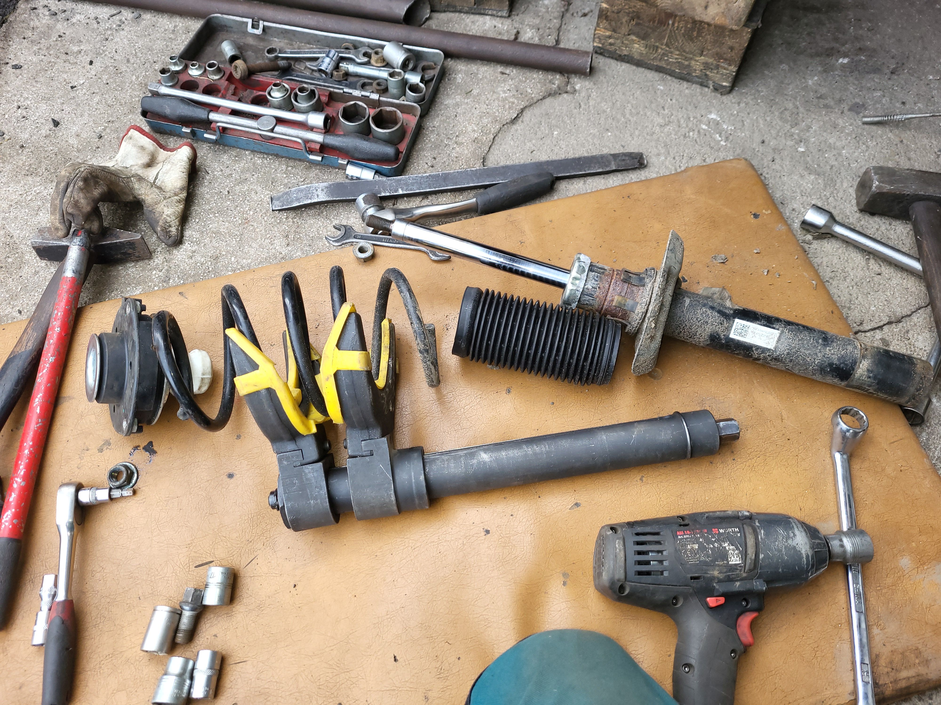vemem menší majzlík a roztáhneme třmen těhlice poté sklepnem třmen z těhlice a odložíme na podložku votevřem kapotu motoru pod oknem si stáhnem gumové těsnění nadzvednem u podběhu plast a povolíme 3 šrouby co drží uložení s tlumičem a de to celý ven ted si jen povolíme matku co drží to horní uložení - jen povolit