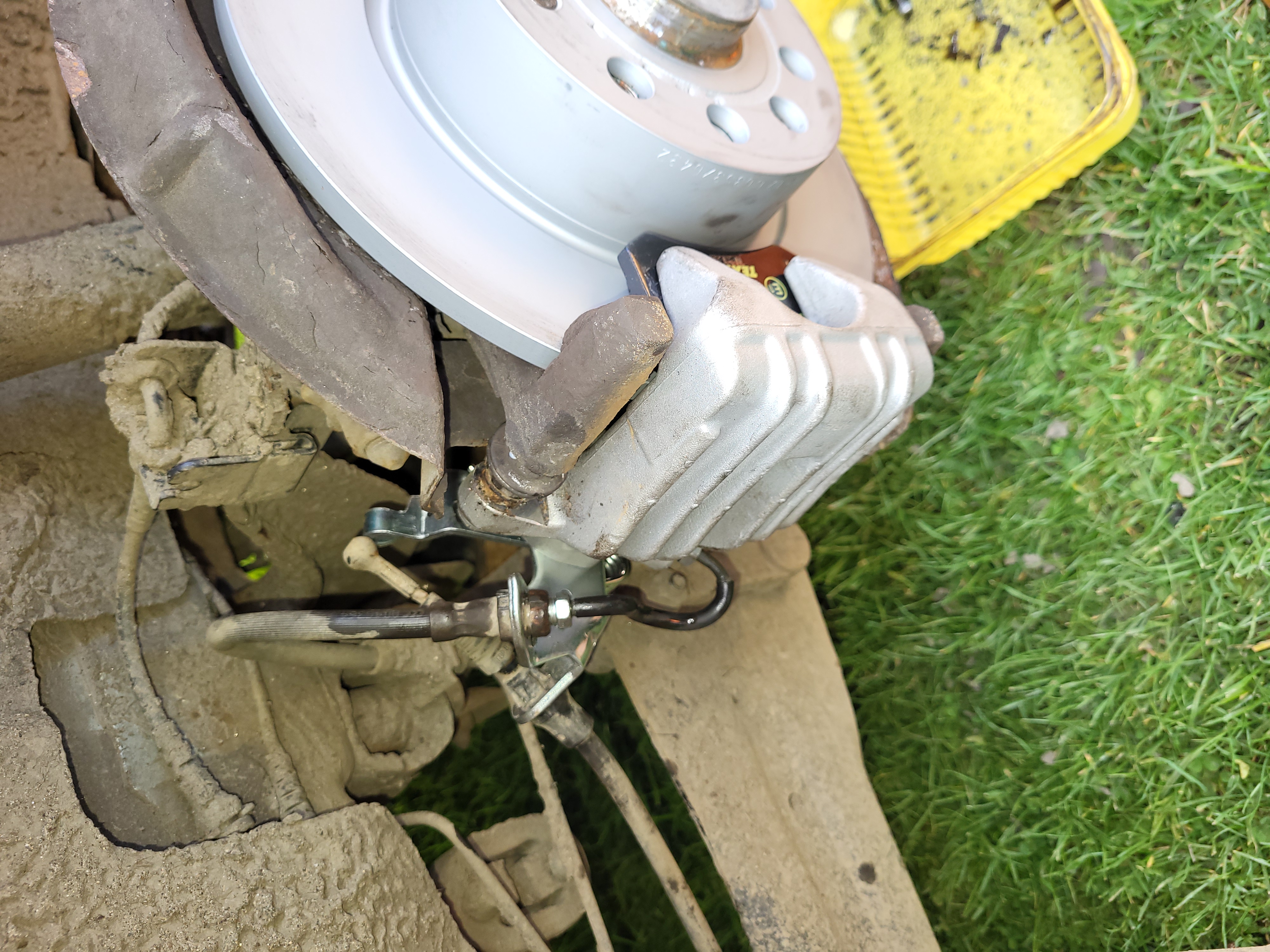 na lanovodu sou plastový západky ty zamáčknem a lanovod vycvaknem z držáku ted si vyklepnem sponu co drží brzdovou hadici ted si povolíme samotný brzdič vyklepnem starý brzdový desky povolíme šroub co drží brzdový kotouč a sklepnem ho dolů ocelovym kartáčem důkladně vydrbeme náboj kola a držák brzdových desek
