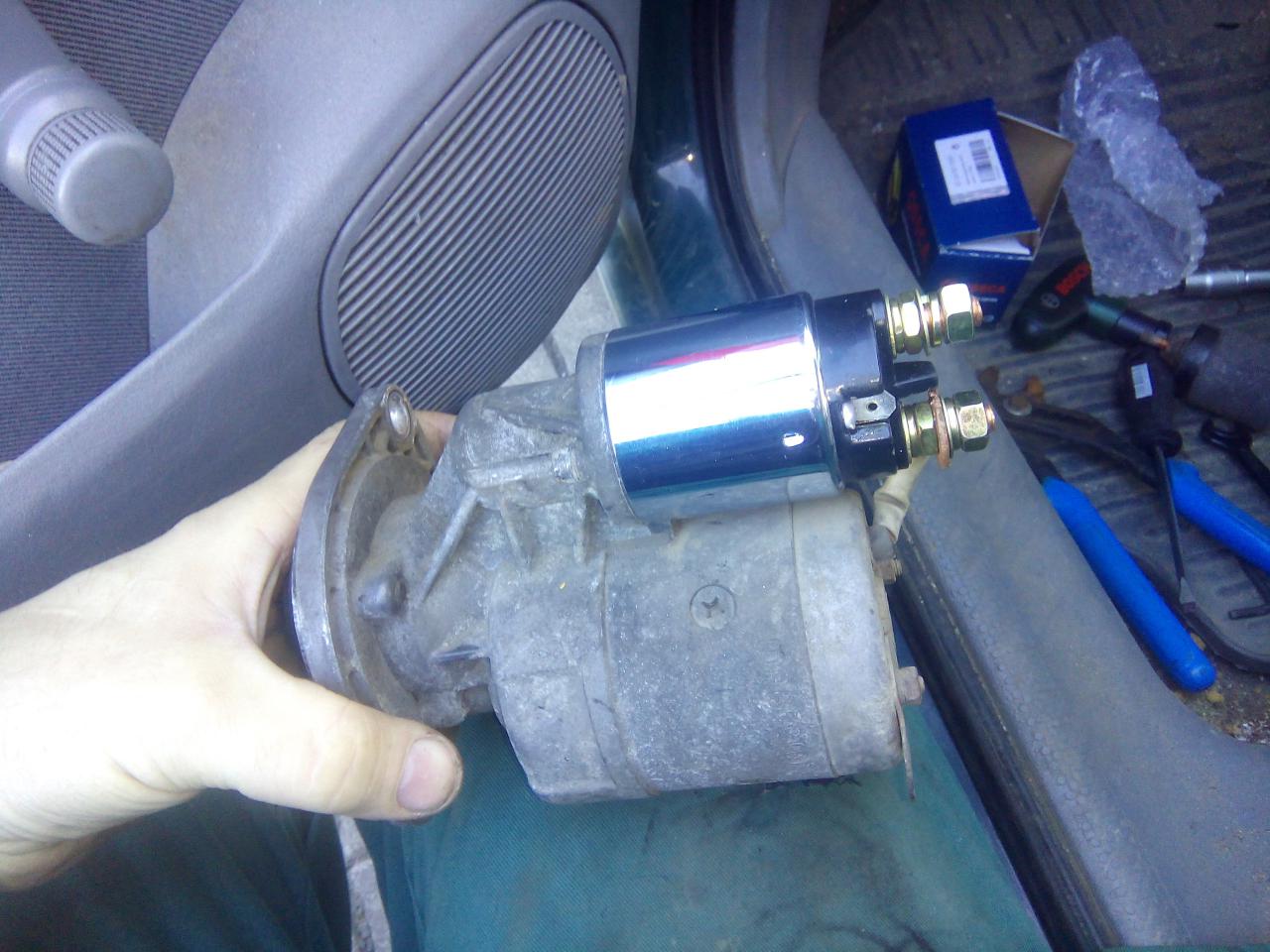 složený startér namontujem zpět do vozu, zapojíme kablík na civku,zapojíme na cívku očištěný přívodní plus z baterie a přetáhnem přez něj gumovou krytku a nacvaknem kablík do držáku
