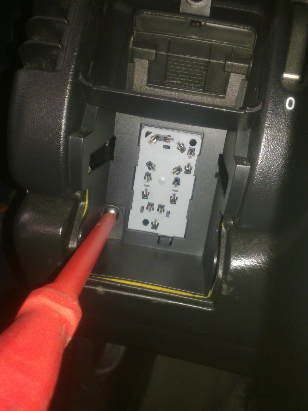 ted vycvaknem spínač světel a postupně vycvakáme mřížky výdechů jedna na straně řidiče,dvě na středu viz.foto,postupujem opatrně neb se to dá rychle ulomit já používám dva tenčí ploché šroubováky